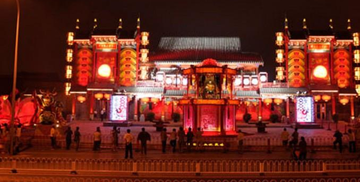 泰安新天街"刘老根大舞台"位于山东省泰安市岱岳区正中心以西,紧临京沪高铁泰安站,是本山传媒2013年重点打造的全新剧场。剧场古香古色,分上下两层,可同时容纳千余人观看演出。无论从整体设计布局还是规模上都是目前一流二人转剧场之一。