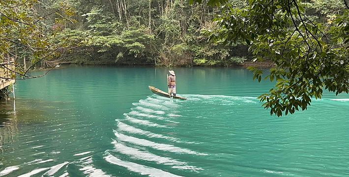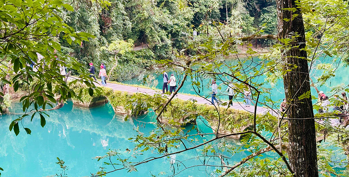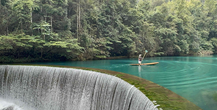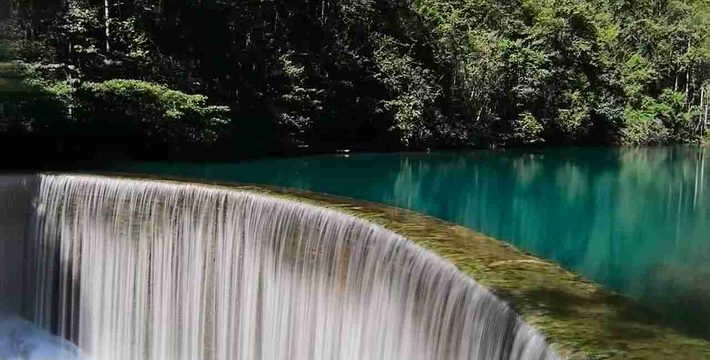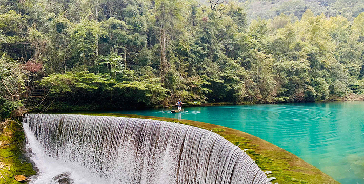 水上森林,长约600米,分上下两段。河谷里丛生着茂密的乔木和灌木,形成一道翡翠屏障,可谓是“水在石上淌,树在水中长”的奇景。