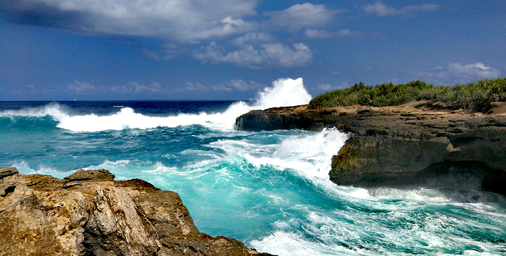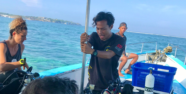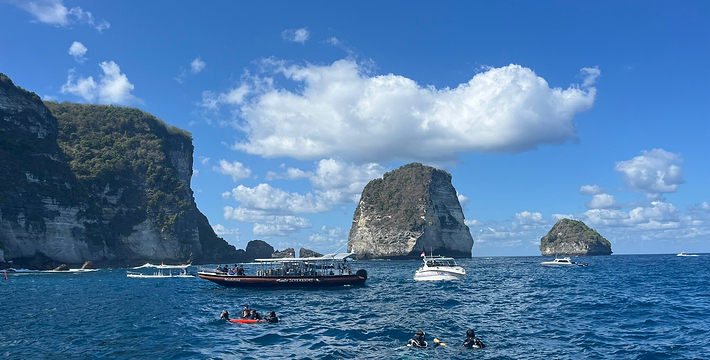 船在靠近蓝梦岛的地方有个小的浮台,上面可以进行很多海上娱乐项目,香蕉船、玻璃底船、小舢板,水上滑梯和浮潜等等。蓝梦岛离巴厘岛有一个小时多一点的船程,需要提前预定船票和接送的汽车。