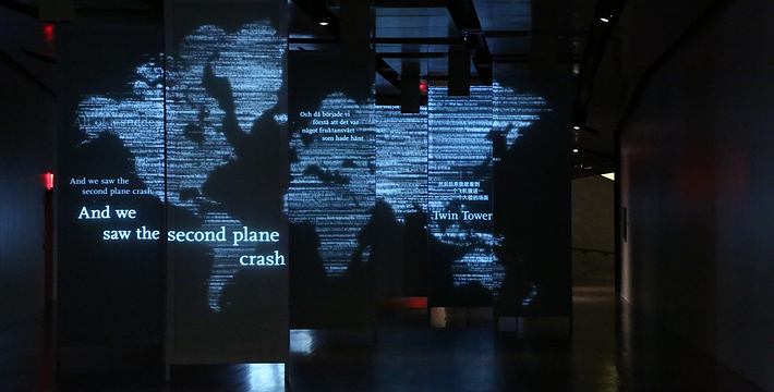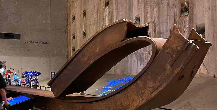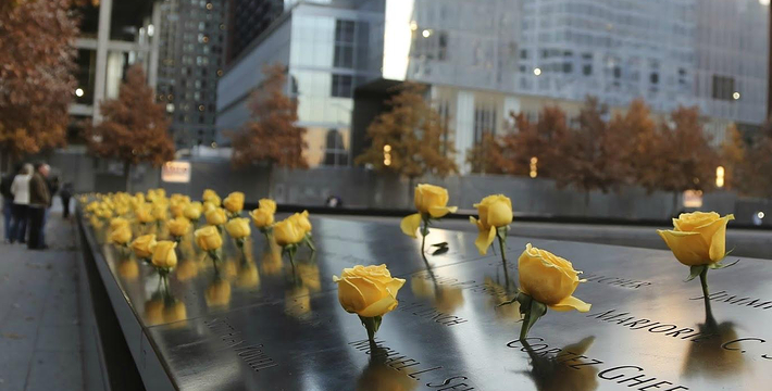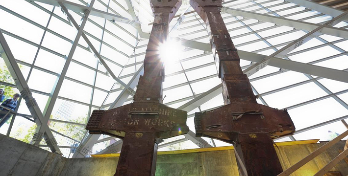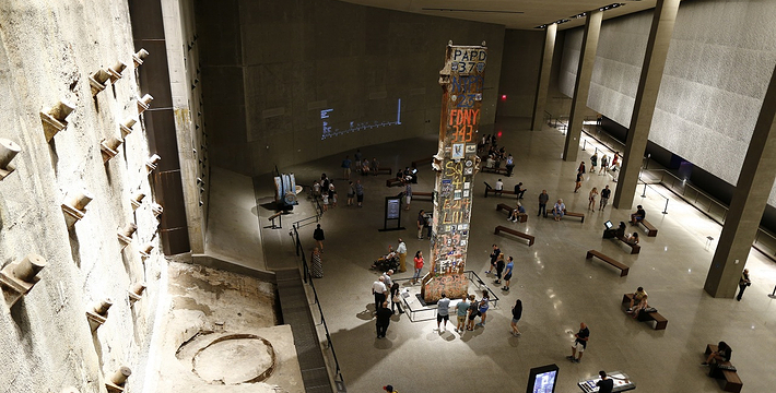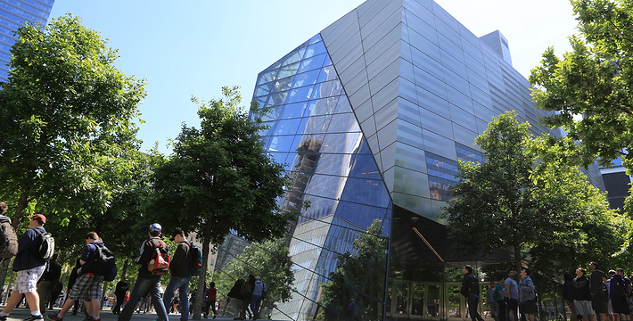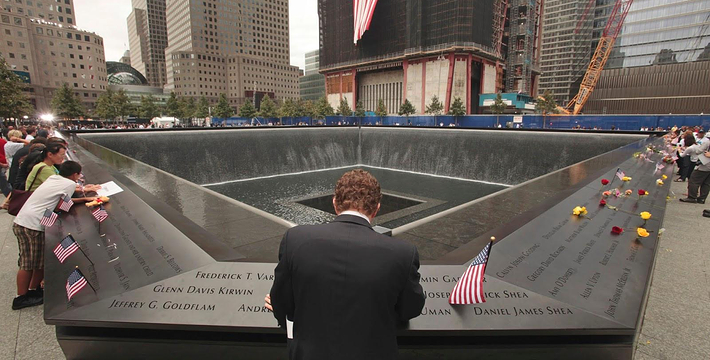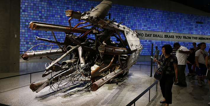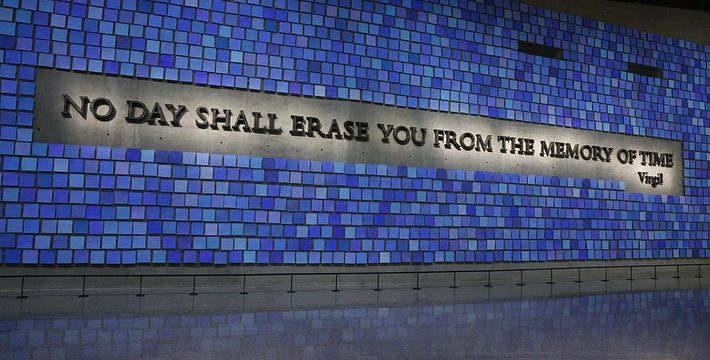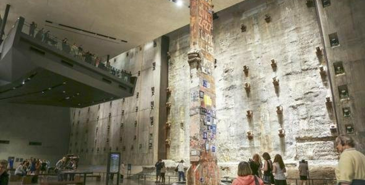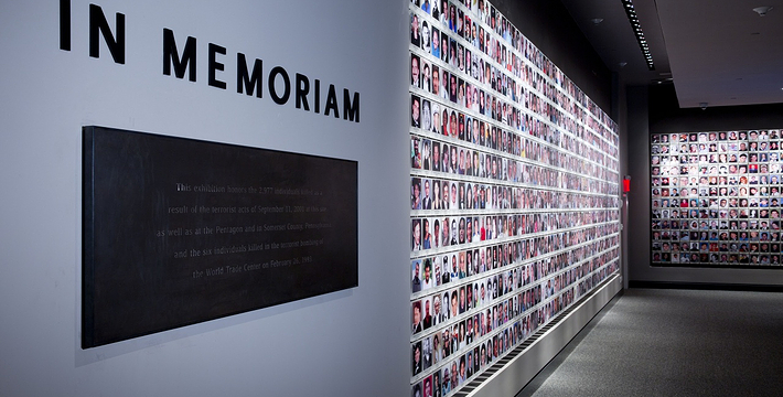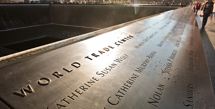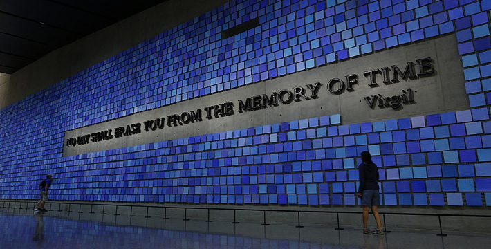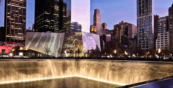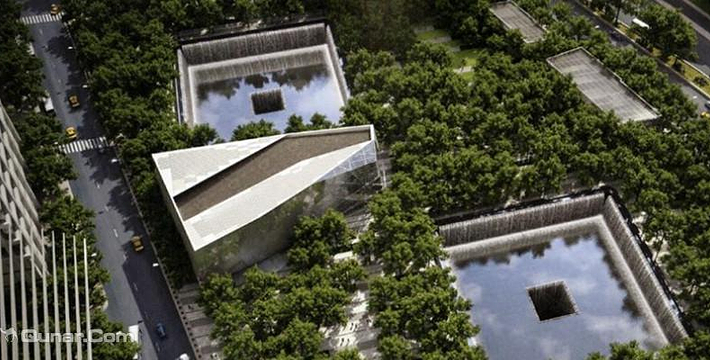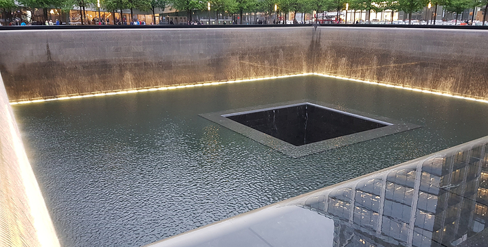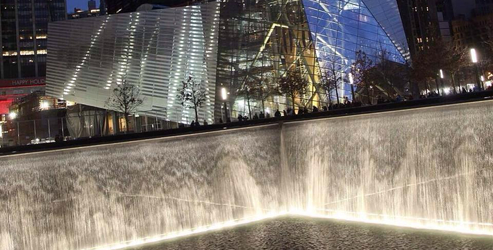 在恐怖袭击事件911发生后的十年后(2011年9月11日),美国政府将事件发生地纽约世贸中心(World Trade Center)双子塔楼辟为911纪念馆,于2011年9月12日向大众开放。911纪念馆覆盖面积8英亩(约3万多平方米), 2个下沉式方形水池即纪念池建在原双子塔楼基座(911发生地),很好地体现出设计师“倒映时空”的理念。纪念池川流不息的水流代表着美国人民对911遇难者源源不断的思念。2,983名遇难者的名字被刻在76块大型青铜铭板上,环绕排列在纪念池四周。