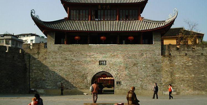 东门城楼位于凤凰古城城东,紧靠沱江。原名“升恒门”(南门曰“静澜门”,西门叫“卓城门”,北门为“壁辉门”),寓意日月永恒,面对东岭,侧临沱江,为凤凰古城四大城门之一。东门城楼始建于清康熙五十四年,城墙全部用紫红砂石建筑,上部城楼则用古砖砌成筑城楼,皆因军事防御需要而建。城门宽3.5米,高4米。呈半圆拱,两扇门都用铁皮包裹,用圆头钉密钉,牢实坚固。而城下的东门街,是古城旅游商品一条街,这里的六色坊有很多苗族的民间艺术品和工艺品供游客选购和参观。