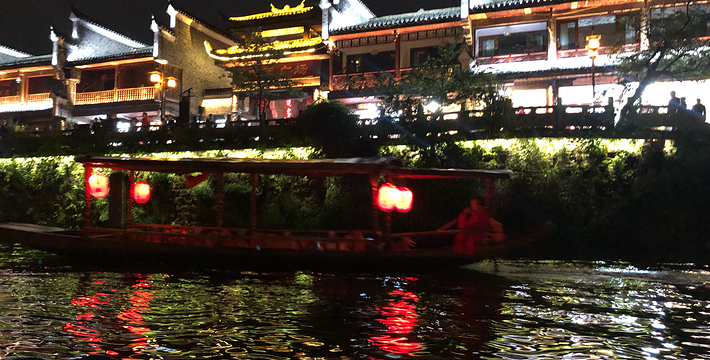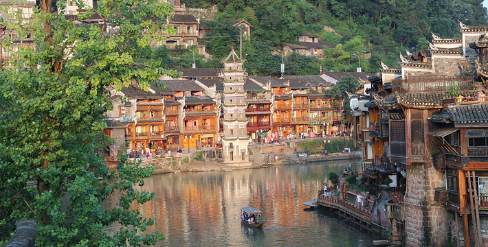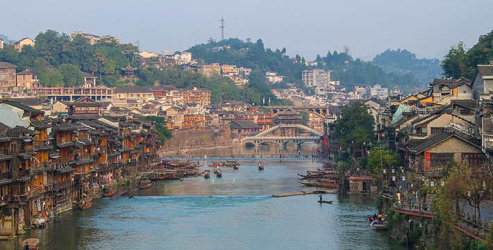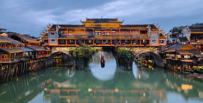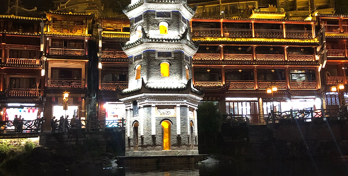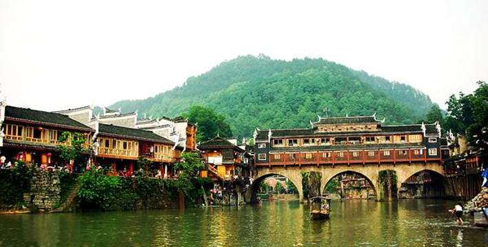 这座桥始建于明洪武初年,颇信风水的凤凰人都说,这座桥斩断的是一条龙颈,令一条巨龙身首异处。怪只怪那位和尚出生的安徽小子朱元璋,听信一位从昆仑山开始追索一支龙脉,经云贵高原来到五寨司城的阴阳先生的谗言,说这儿屏立南郊气势非凡的南华山和与之一脉相承一头扎入沱江的奇峰,就是他要寻找的龙头。并由此推断出总有一天这地方会有人出来问鼎中原,真命天子将出。那位朱皇帝岂能允许边远的凤凰有他潜在的对头于是朱笔一勾,龙颈被斩,凤凰风水遭毁灭性破坏,凤凰再也出不来皇帝了。这些老一辈的老一辈留下的传说,我们遑论真假,但桥是有了。而桥下的那条潭,自古以来就叫“回龙潭”。靠近南岸,以前依山傍水还修建有一座“回涛阁”。清代诗人王家宾还为此作诗一首:危楼俯瞰碧波寒,回绕苔矶涌雪湍;绝似中流擎砥柱,不教江水起狂澜。