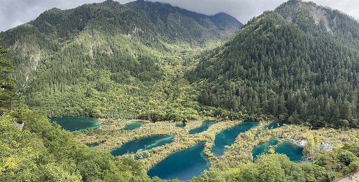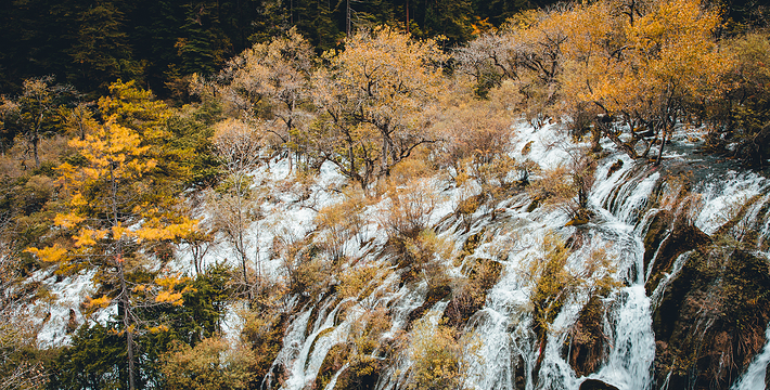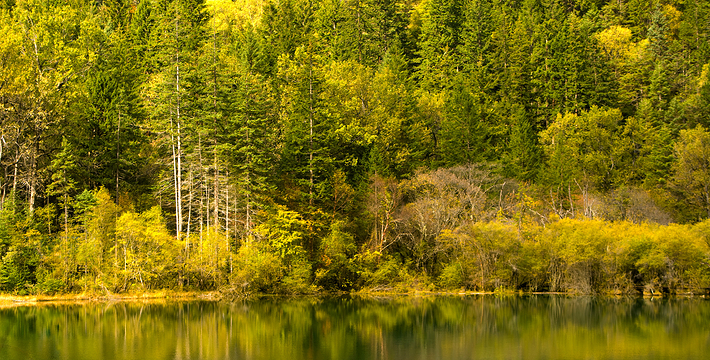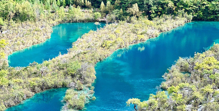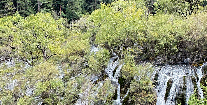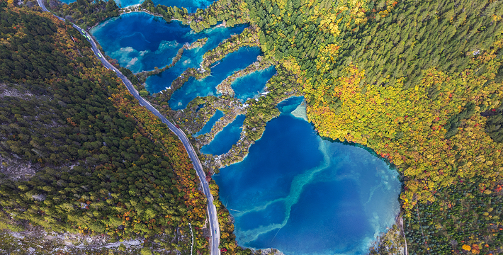 九寨沟四周群山耸峙,有雪峰数十座,高插云霄,终年白雪皑皑。河谷地带奇水荟萃,其间有成梯形分布的大小湖泊114个,瀑布群17个,钙华滩流5处,泉水47眼,湍流11段,以1870米的海拨高差,在12 座雪峰之间穿林跨谷,珠连玉接,呈Y字型串珠,逶迤近60公里、世界罕见的以高山湖泊群和瀑布群以及钙华滩流为主体的风景名胜区。湖泊小者数平方米7公里。湖水终年碧蓝澄澈,色彩斑谰,在阳光照射下,呈现出蓝、黄、橙、绿等多种色彩,绚丽夺目。天气晴朗时,蓝天、白云、雪山、森林倒映湖中,水光浮翠,美丽如画,并随季节推移呈现出不同的色彩和风韵,有“九寨归来不看水”之说。