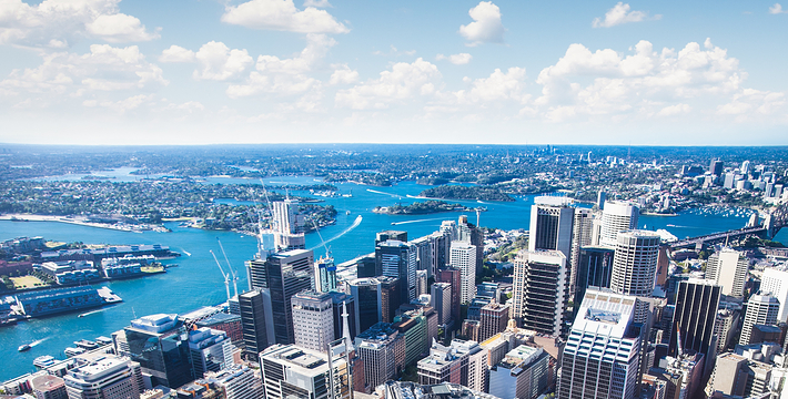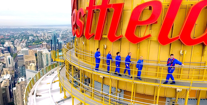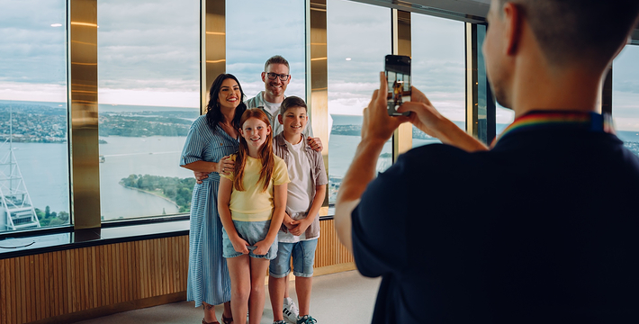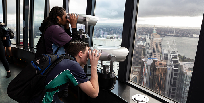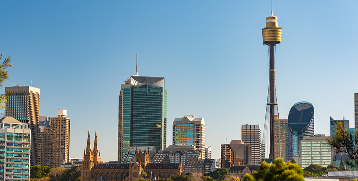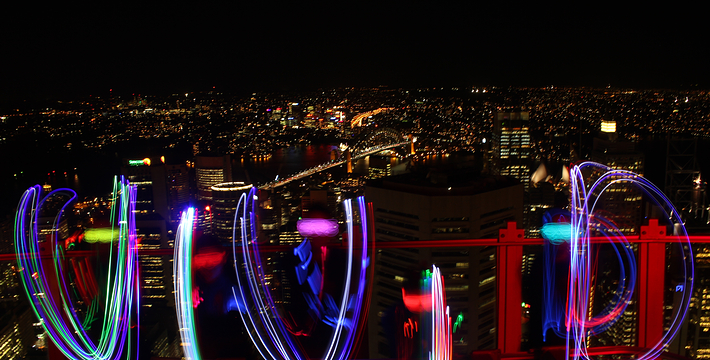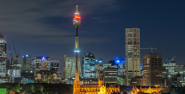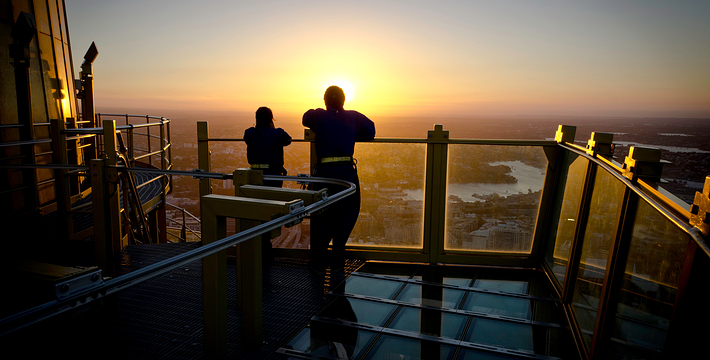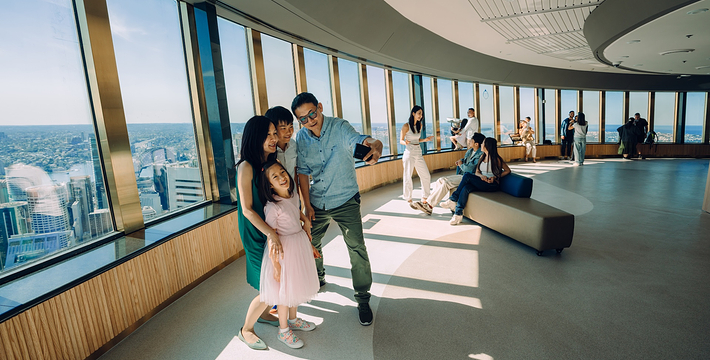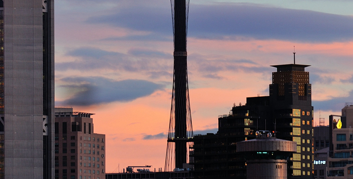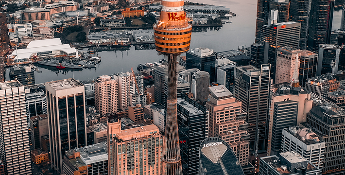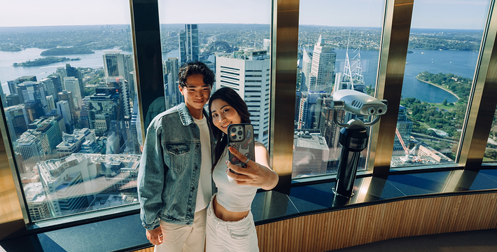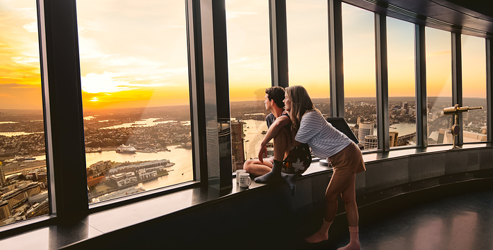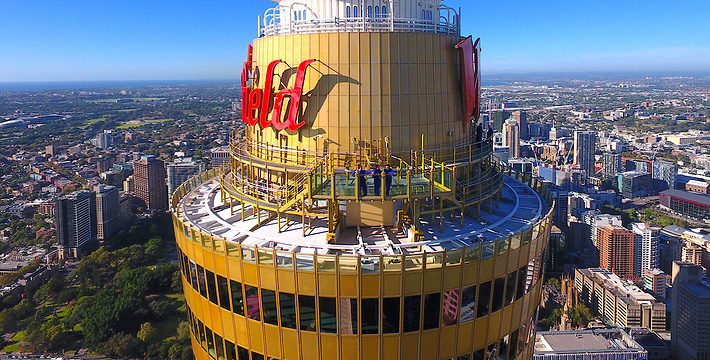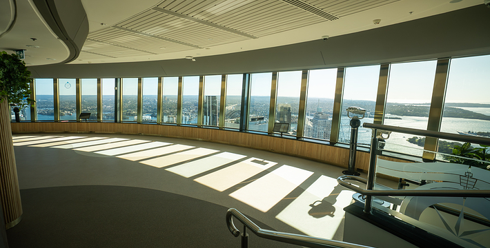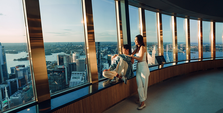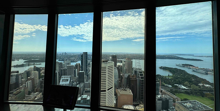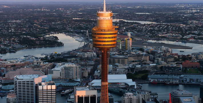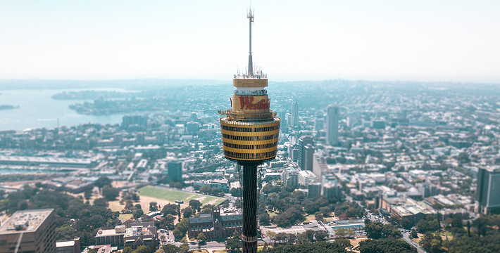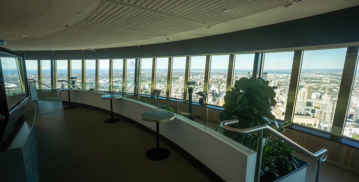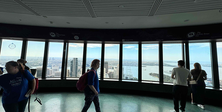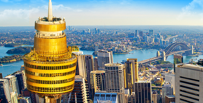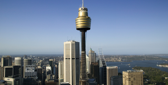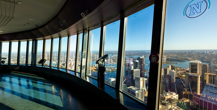 金顶的悉尼塔(AMP Tower)建成于1981年,是世界伟达联邦的一员。楼高300米(展望台离地高250米),由56根每根重达7吨的巨缆支撑,塔内有两个旋转餐厅、一个观赏层和一家咖啡馆,参观这里的中央点也是相当值得的,因为搭乘高速电梯只花费40秒的旅程本身就是一个令人难忘的经验。360度透明观景台使所有景观一览无遗,北边望去有雪梨港湾大桥、岩石区、雪梨歌剧院、环型码头;西边有达令港各景点,甚至可远观至2000年奥运场地Homebush Bay。东面的著名旅游点包括海德公园、列王十字区、议会大厦、皇家植物园、新南威斯博物馆等;往南则有维多利亚女皇购物中心等地。观赏层特别备有高倍数望远镜拓展你的视野,游客可以看到整个悉尼港和海洋的另一端,西边则远到80公里外的蓝山山脉。前往雪梨塔要从Centerpoint大楼进入。Centerpoint大楼的1楼和2楼分别为Pitt Street Level和Castlereagh Street Level,均为购物中心,3楼的Gallery Level是前往雪梨塔旋转餐厅的电梯入口,并可通往Grace Bros和David Jones购物中心,要前往雪梨塔观景台,须从4楼的Podium Level进入。