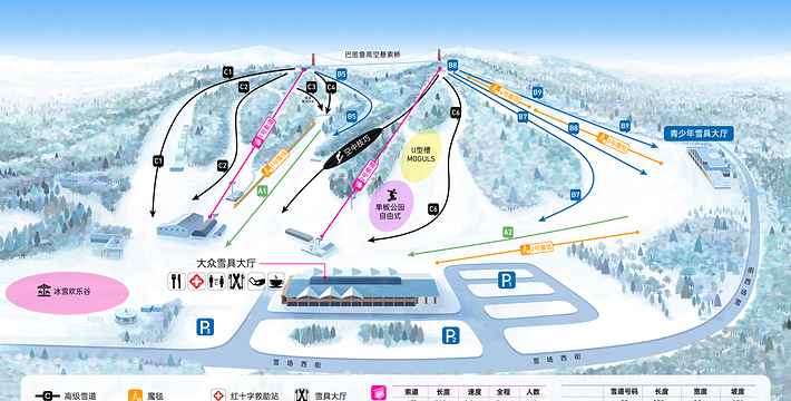 共开设了6条初、中、高级滑雪道,可满足不同滑雪水平游客的需求。