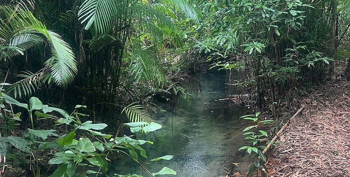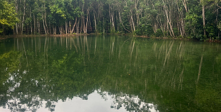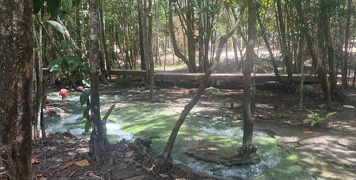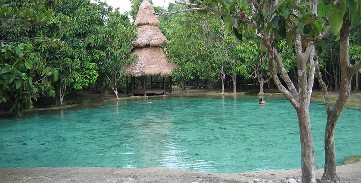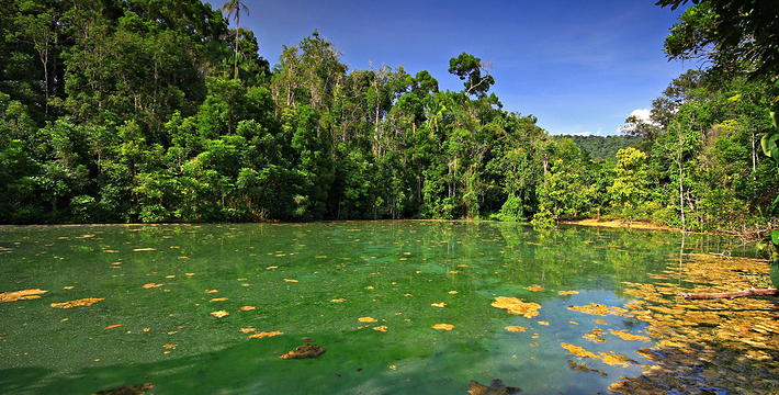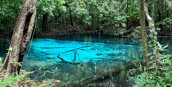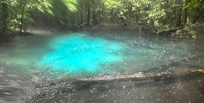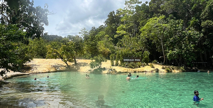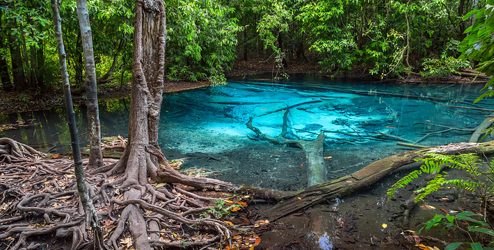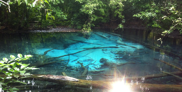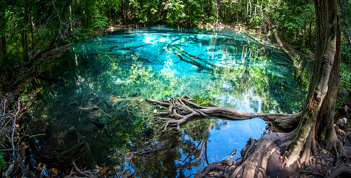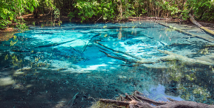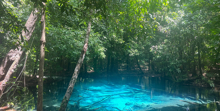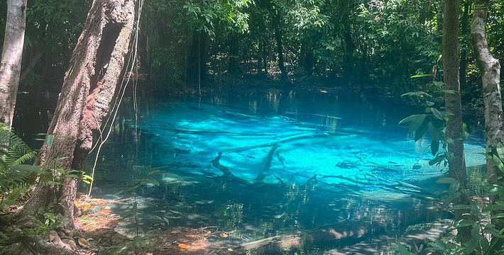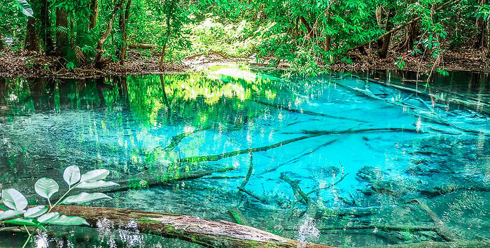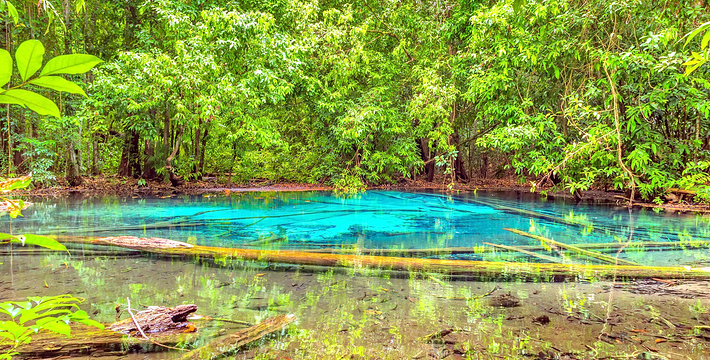 甲米翡翠湖被中国旅行者称为”泰国的小九寨沟“,因为这里的湖水呈漂亮的翡翠色,清澈见底,可以清晰看到水底纵横交错的枯木,湖心不断翻滚涌出浑浊浪花,湖水的颜色还会根据不同的光线以及不同时发生变化。另一方面,与九寨沟不同,翡翠湖水面是对旅行者开放的,因此很多旅行者都带上泳衣泳裤来到这里畅游。在湖内游泳戏水请注意松软湿滑的地面,以免发生意外受伤。其附近有一收费景点 蓝池(Blue Pool)。