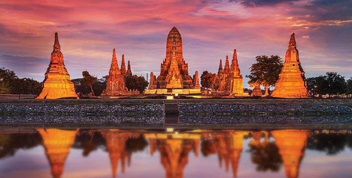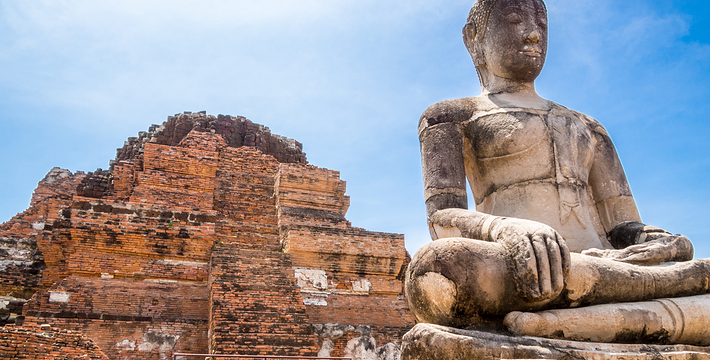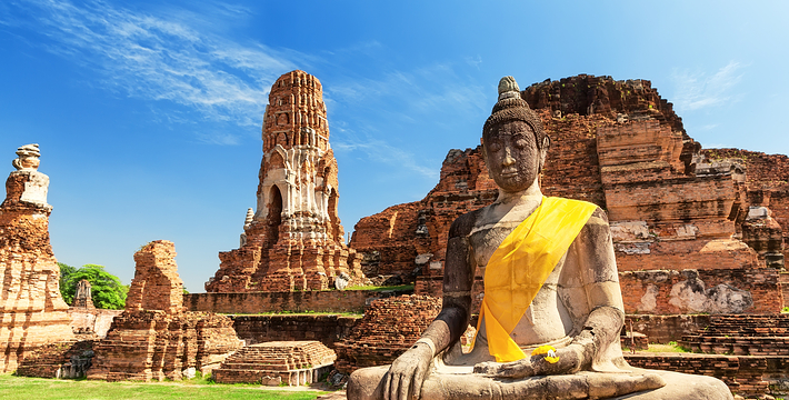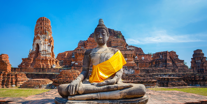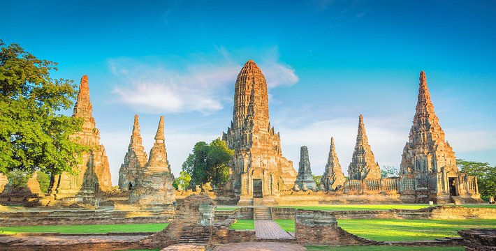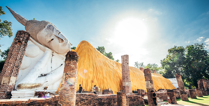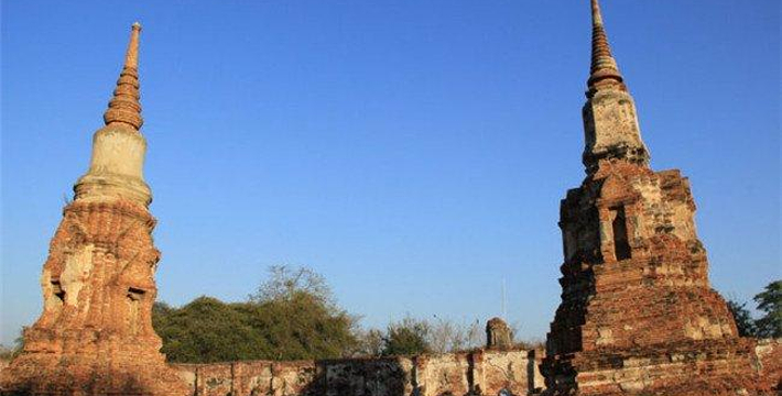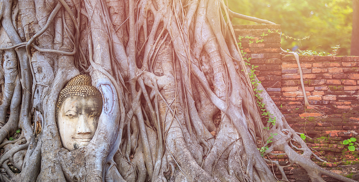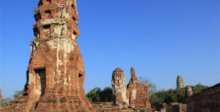 欧美人都翻译成 玛哈泰寺 是音译,也有的叫 帕玛哈泰寺 Wat Phra Mahathat。里面也没有大佛,不知日本人为何翻译为 大佛寺。 玛哈泰寺 与三王寺齐名,也是一座充满荣枯盛衰的寺庙遗址。它建于14世纪的 包若玛拉嘉一世 Borom Rachathirat I 1370-1388 时期。遗址群中间的主塔曾高达44米,在后来的战乱中毁坏,现在只剩下底部的基座等遗迹,一些更完整的佛塔环绕在四周。从围绕四周的佛塔上依稀可以看到当时以灰泥装饰的痕迹。中央佛塔在1911年倒塌,1956年在地下室发现了佛像及众多宝石,现在都存放在国家博物馆中。 它位于古老的圣城中心,走进寺庙,更像是走进了一大片树林,使得炎热的天气一下子变得凉爽了许多。被触角一样的榕树根环抱的著名的佛头也在这里。由于该寺被森林包围并侵蚀,一尊佛像的头部被缠绕在盘旋的树根当中。这种圣像和大自然纠缠在一起的现象在泰国佛教里是极其幸运的兆头。所以这个遗址常常接受施主的捐赠。还有布满青苔的塔基,没有头的佛像,缅甸军队破坏后的遗迹令人心痛不已。 榕树包佛头:大城著名的榕树包佛头就在这里。一颗佛陀的头被包裹在树根中,就像从树中生长出来一样已经和树是那么浑然一体。