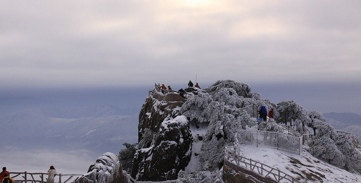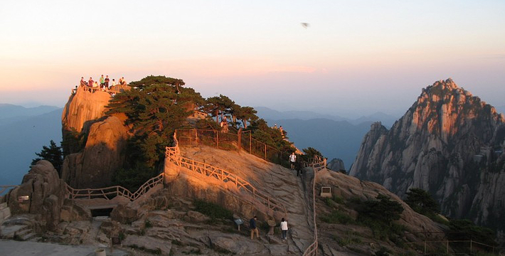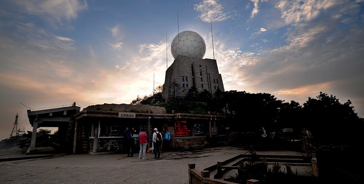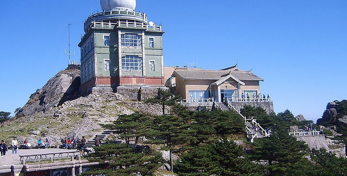 不到光明顶,不见黄山景。黄山第二高峰光明顶,海拔1860米。明代普门和尚曾在顶上创建大悲院--黄山气象站。因为这里高旷开阔,日光照射久长,故名光明顶。 顶上平坦而高旷,可观东海奇景、西海群峰,炼丹、天都、莲花、玉屏、鳌鱼诸峰尽收眼底--黄山气象站就设在这里。由于地势平坦,所以是黄山看日出。