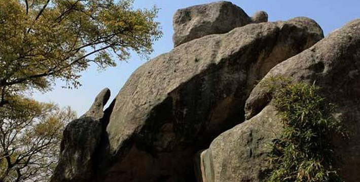 二龟听法石位于磐陀石西,五十三参石下端的岩崖上有两石酷似海龟,一龟蹲踞崖顶,回首顾盼,似有等候之意;一龟缘石直上,昂首延颈,筋膜尽露,一副着急相。两龟的形态极为传神,令游人叹为观止。相传两龟受龙王之命前来探听观音菩萨说法,只因听得入了迷,忘了归期,遂化身为石。也有传说,两龟原为一雌一雄,因尘缘未绝,在听法时眉来眼去,顾盼传情,所以被罚作石龟,给修行不诚者作戒。前者传得奇,后者传得妙,各有千秋。