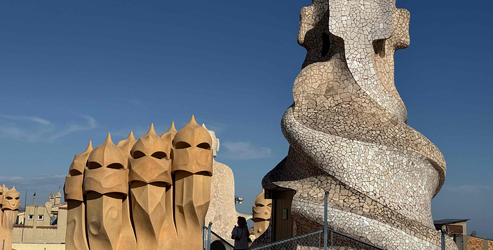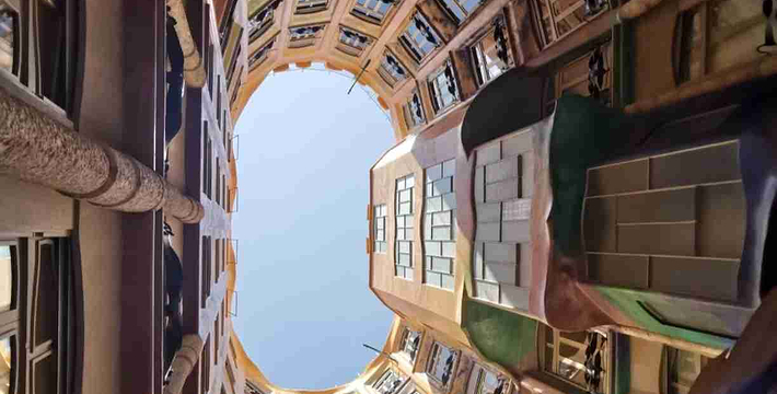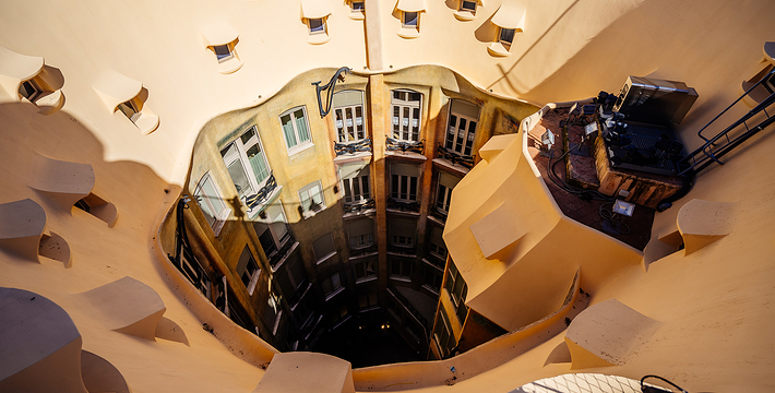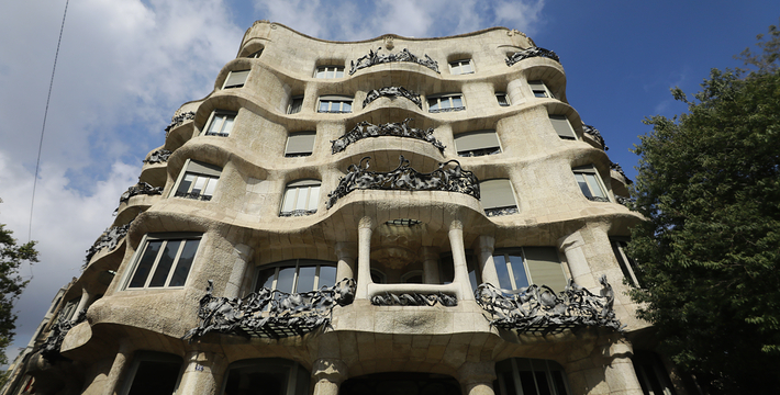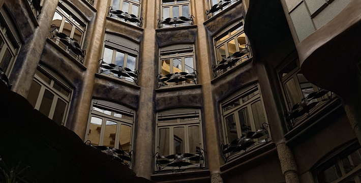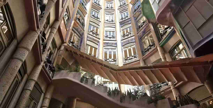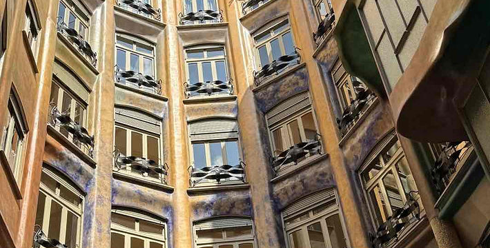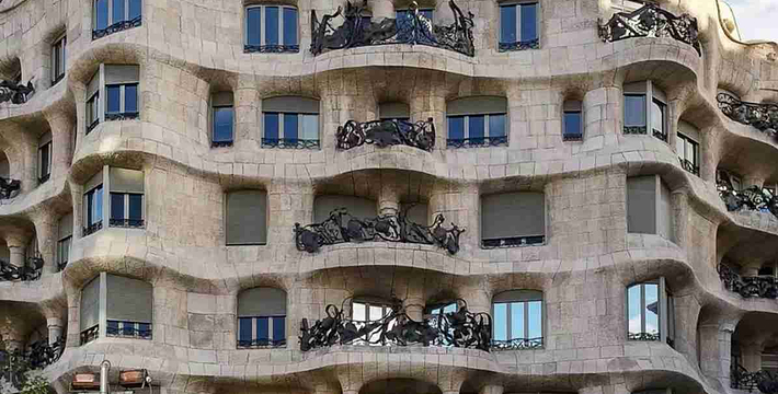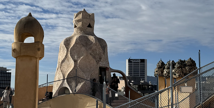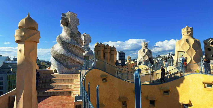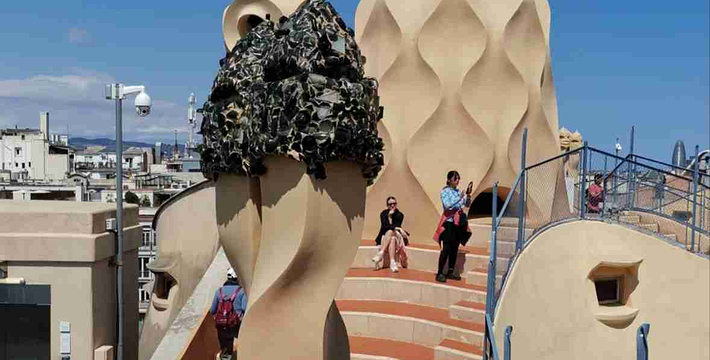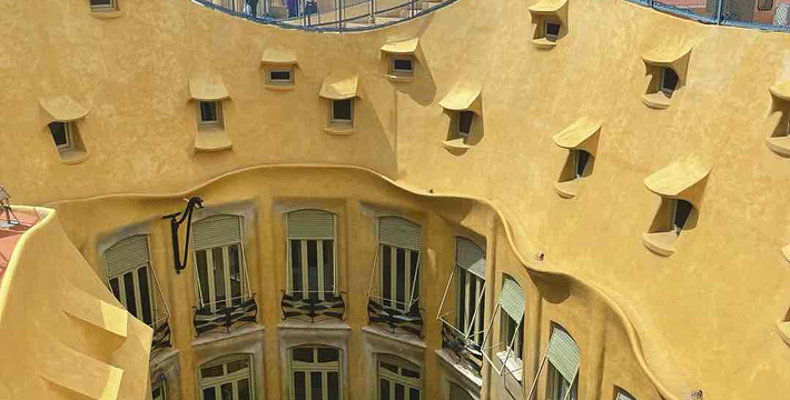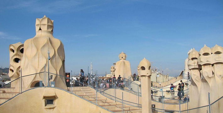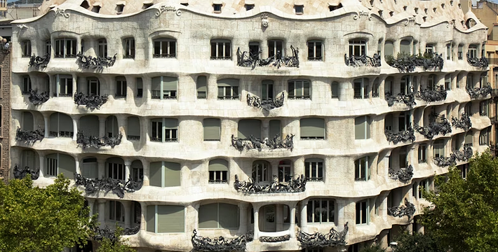 在西班牙巴塞罗那的帕塞奥.德格拉西亚大街上,坐落着一座纯粹现代化风格的楼房-米拉公寓,又名“采石场”。它以怪异的造型而闻名于世,是由西班牙建筑设计师安东尼 ·高迪专门为实业家佩德罗·.米拉设计建造。米拉公寓位于街道转角,地面以上共有六层,墙面凹凸不平,到处可见蜿蜒起伏的曲线,整座大楼宛如波涛汹涌的海面,富于动感。高迪还在米拉公寓房顶上造了一些奇形怪状的突出物,有的像披上全副盔甲的军士,有的像神话中的怪兽,有的像教堂的大钟。其实,这是特殊形式的烟囱和通风管道。后来它们与古埃尔公园和圣家族大教堂一样,也成了巴塞罗那的象征。