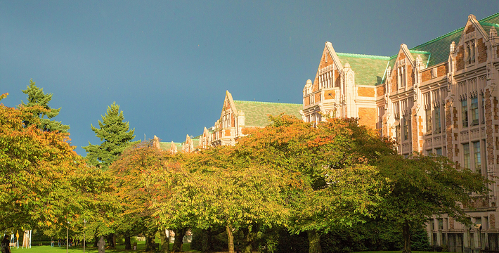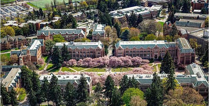 华盛顿大学占地极为广阔,其地理位置非常好,不仅濒临Portage Bay和Union Bay,面对着广阔如海的华盛顿湖,而距离市中心也只有15分钟的车程。华盛顿大学的正门有几个高大的图腾柱,这是华盛顿大学的特有景致,也是美国西北部原著民的特有象征,一走进大学,立刻就会为那一栋栋美轮美奂的欧式建筑所倾倒,就象是置身于欧洲的某一个城市一样。在这里不仅能看到歌德式尖顶造型的建筑,还有有着巴洛克式华丽装饰风格的大楼,有的气派宏伟,有的精致典雅,但无不透露着浓厚的古典气息。