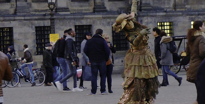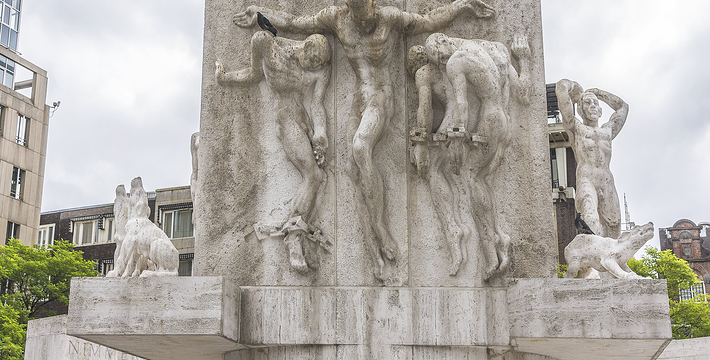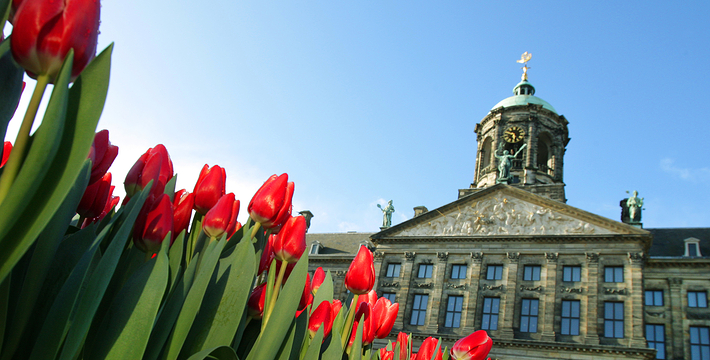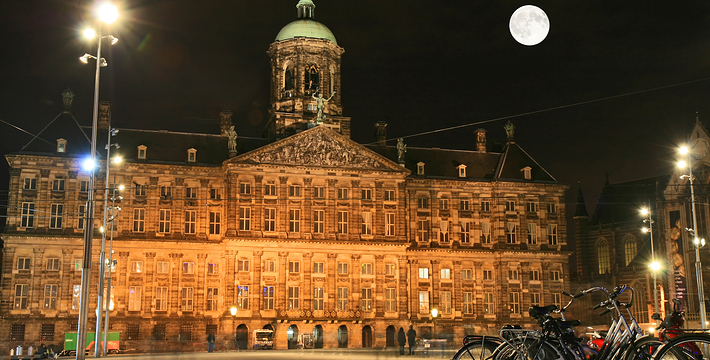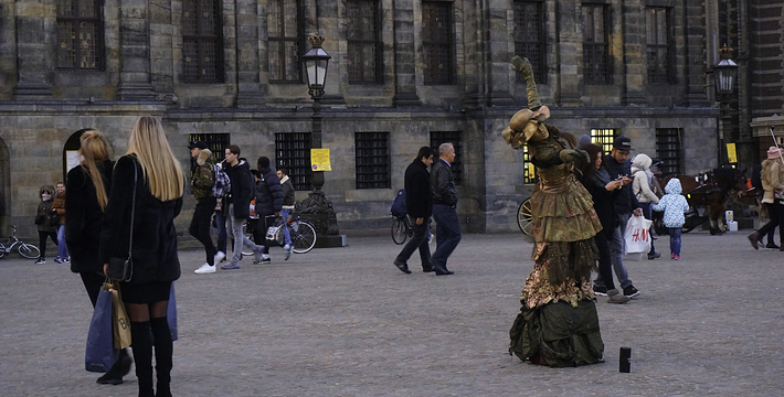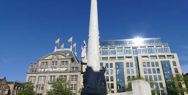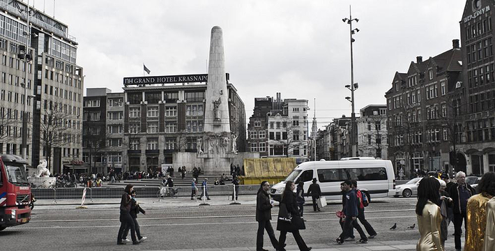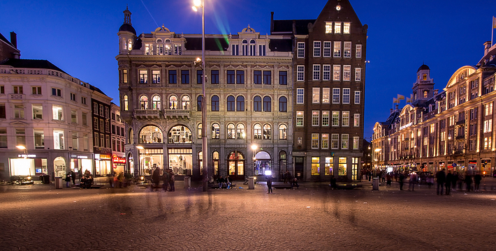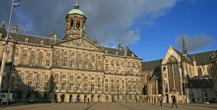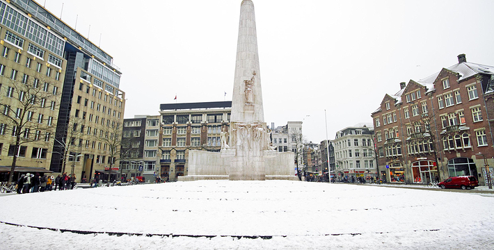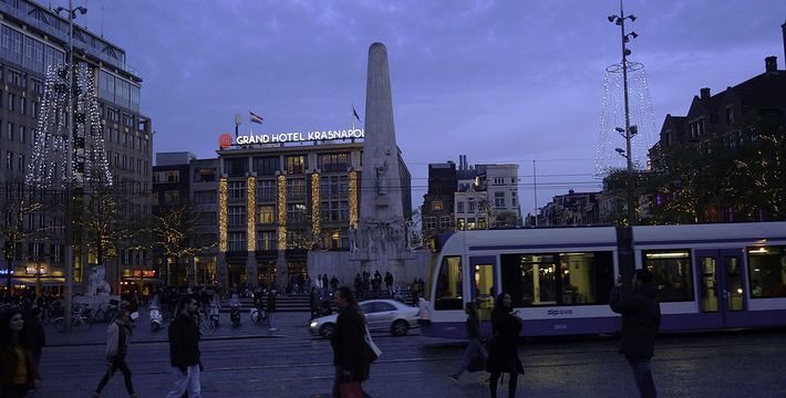 水坝广场原本是建筑于12世纪末,阿姆斯托河(Amstel)上的一个水坝广场的北方也就是现在的旧城区,这个区域的房子以前都是一家家的商店,热闹非凡。这里还出过一位名人——Zacharias Jansen,也就是望远镜的发明者。水坝广场几世纪以来一直就是整个城市的政治中心与商业中心,以前的市政厅、计量所和于市场都曾驻扎于此,而各种理由的政治骚动也都在这里举行过,例如挑衅运动、反越战等等。不过,现在的水坝广场只是个人潮聚集的繁荣商业区而已。阿姆斯特丹新的市政厅是在1648年开始兴建,由于地质的关系,整个建筑物用了1万3千多根木桩将其支撑起来的,而新市政厅古典而宏伟的建筑风格。1808年当法国占领荷兰时,路易拿破仑(Louis Bonaparte)选择了新市政厅作为他的住所,而新市政厅就此改名为王宫(Koninklijk Paleis)。广场上另一个引人注目的建物就是人民纪念碑(Nationaal Monument),她是为了纪念二次大战期间受纳粹迫害的牺牲者所设立的,每年5月5日的解放纪念日,都会在此举行追思的活动。
