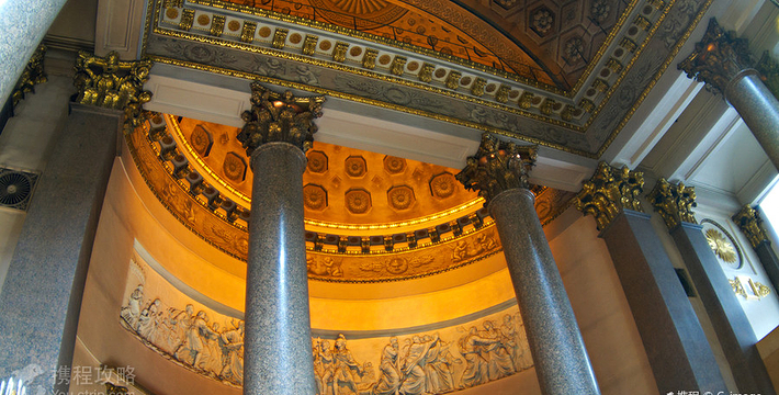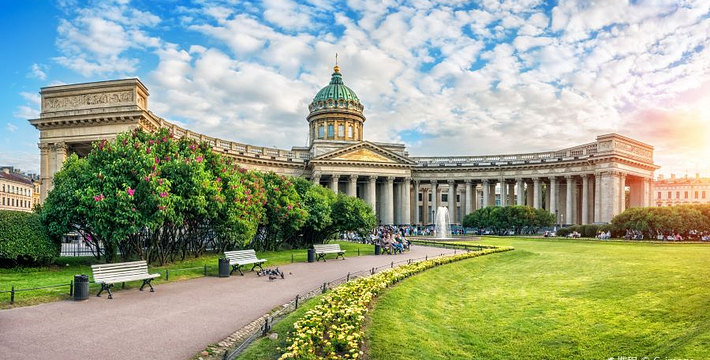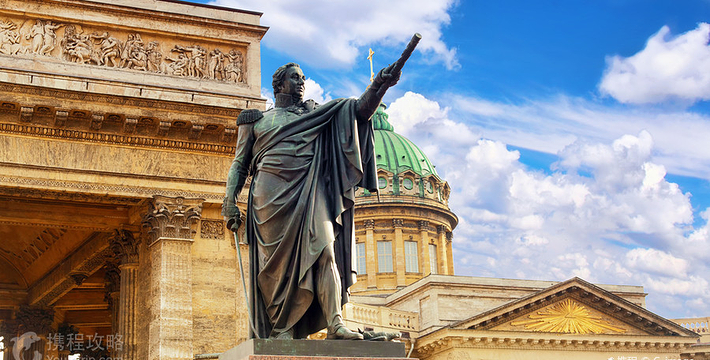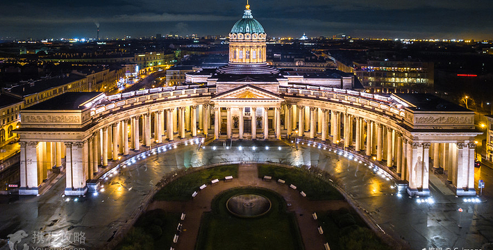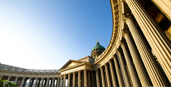 喀山大教堂位于圣彼得堡的涅瓦大街上,由俄罗斯建筑师沃罗尼欣设计,于1801年8月开始奠基仪式。教堂以古罗马圣彼得教堂为原本,历经10年于1811年竣工。但是由于教堂的正门面向北方,侧面面临涅瓦大街很不美观。所以,在教堂东面竖立94根科尼斯式半圆型长柱长廊使喀山教堂变成典型的俄式教堂。