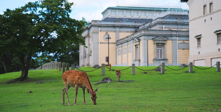奈良公园位于奈良市街的东边,东西长4公里、南北宽2公里,面积广阔,若草山、东大寺、春日大社、国立博物馆等奈良的名胜古迹大多在这里。在明治21年(1888年)成为县立公园,是日本现代公园的先驱之一。大正11年(1922年)被指定为日本的国家名胜。 成群嬉戏于公园里的鹿,因与春日大社流传的白鹿传说有关而受到保护,且被指定为国家的自然保护动物4、5月,或是满山红叶的秋天等出游行乐、毕业旅行的季节。但是,在淡季时您可悠闲自在的在此散步。一年四季无论何时,这里都有吸引人的景观。 其中有1200头鹿生活在这里,这些鹿大多温顺而讨人喜爱。