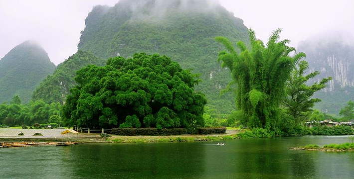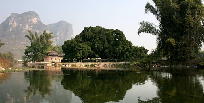 阳朔大榕树(千年古榕)位于漓江风景区内,名“穿岩古榕”。阳朔城南7.5千米的高田乡穿岩村金宝河南岸,有一棵古榕树冠呈圆形,远望是一把绿色巨伞,近看盘根错节,叶茂蔽天。传为晋代所植,距今已有1500多年树龄。古树下,金宝河缓缓而流,明净如镜。隔岸平地拔起一小石山,中间对穿一孔道,似巨型石门洞开,五色斑斓,称穿岩。岩间一村,即穿岩村。小河为一坝截拦,水涨时水滚坝面,给幽雅的环境增添了声光及动态。古椿树下有一渡口,“榕荫古渡”为阳朔一景。此处因曾在电影《刘三姐》中作外景,故尤为著名。过工农桥不远,就可以看见在静静流过的金宝河畔耸立着一株特大榕树。它的树围竟有七米多,高达十七米,枝繁叶茂,浓荫蔽天,所盖之地有一百多平方米。相传这是隋朝所植,迄今已有千年历史,虽然树干老态龙钟,盘根错节,但仍然生机勃勃。在电影里,刘三姐就是在这棵树下向阿牛哥吐露心声,抛出传情绣球的。在金宝河的对岸有一座小山,中间的山洞是透空的,就像一座石门,可以让人随意穿行,因此得名:“穿岩”。在榕树和穿岩之间有个渡口,人称“榕荫古渡”。在穿岩的临河处有一块石头,颇像一只胖乎乎的小熊正在爬山。于是民歌唱道:“金钩挂山头,青蛙水上浮,小熊满山跑,古榕伴清流”。