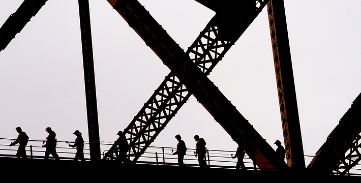 在澳大利亚悉尼的杰克逊海港,这就是著名的悉尼海港大桥。悉尼海港大桥是早期悉尼的代表建筑,它像一道横贯海湾的长虹,巍峨俊秀,气势磅礴,与举世闻名的悉尼歌剧院隔海相望,成为悉尼的象征之一。悉尼海港大桥(Sydney Harbour Bridge, Australia),从“怀胎”到“出世”,前后花费100多年。在经过了40多年的酝酿之后,1857年,悉尼工程师彼得·,其后经过反复修改,到1923年才根据督建铁路桥的总工程师卜莱费博士的蓝图进行招标,由英国一家工程公司中标承建。1924 年悉尼海港大桥破土建造桥基,1932年3月19日竣工通车,历时8年多。悉尼海港大桥这座大桥整个工程的全部用钢量为5.28万吨,铆钉数是600万个3.5公斤,用水泥9.5万立方米,桥塔、桥墩用花岗石1.7 万立方米,建桥用油漆27.2万升,从这些数字足可见铁桥工程的雄伟浩大。在30年代的条件下,能在大海上凌空架桥,实为罕见。