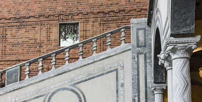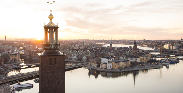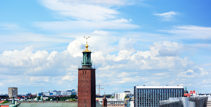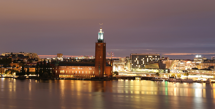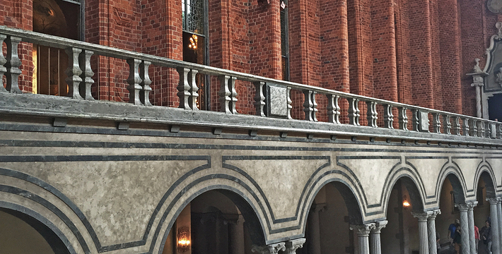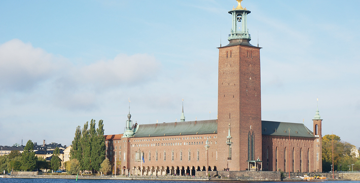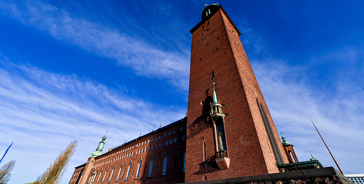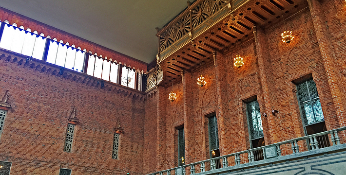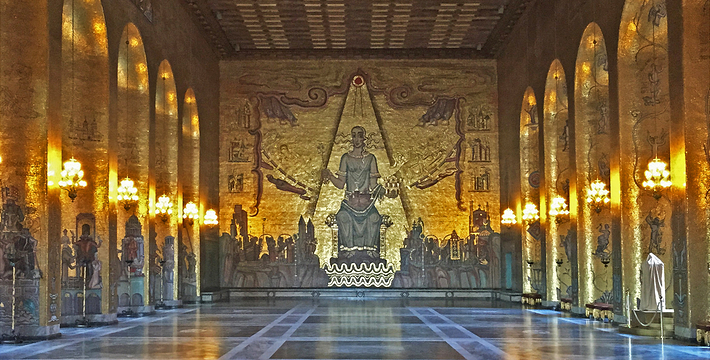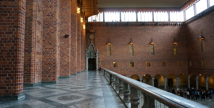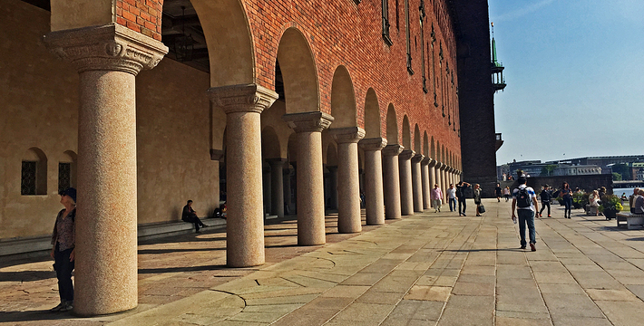 市政厅位于中央火车站之南国王岛(Kungsholmen)东南端,面临美丽的梅拉伦湖。它由著名浪漫派建筑师热纳奥斯伯设计,工期12年,于1923年建成,是一座庞大的褐红色建筑,资金由群众募捐筹集而来,它的落成仪式于1923。该建筑被推崇为20,现已成为斯德哥尔摩的标志。市政厅一端竖着106米高的钟楼,钟楼上的三王冠国徽状的镀金风标,是瑞典王国的象征,也象征当年组成卡尔马联盟的三个成员国―丹麦、瑞典和挪威。每天12点和18点时,钟楼两侧镀金的圣乔治和龙的形象就会活动起来。人们登上这座钟楼,所看到的城市迷人风景是难以忘记的。钟楼内部有一个博物馆,在那里人们可以欣赏到各个不同时期引人入胜的艺术品。市政厅东边有一个华盖,下面是山伯所作的城市创始人伯格吉尔的塑像,一个镀金的石棺状的纪念性建筑物。市政厅内有两个著名大厅:蓝厅和金厅。蓝厅在楼下,后因红砖极美,建筑师临时改变主意,保留了红砖的颜色,所以“蓝厅”实为“红厅”,仅柱廊漆为蓝色。厅内可安排1300位宾客就餐,每年招待诺贝尔奖得主的宴会就在这里举行。参加宴会的有瑞典国王、王后、议长和首相,诺贝尔奖获得主的夫人也应邀出席。