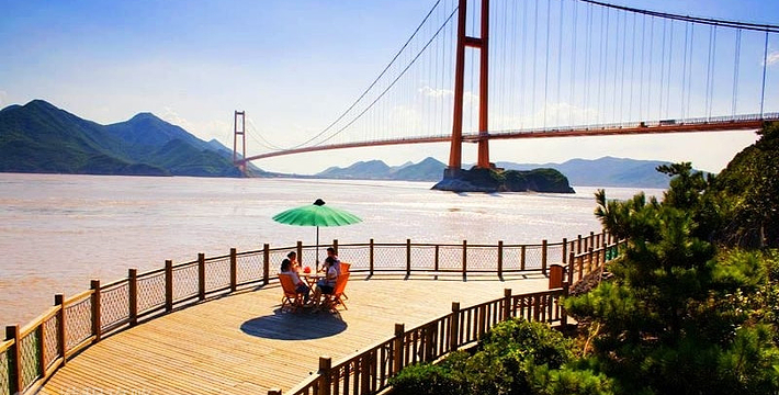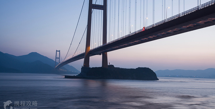 跨越西堠门水道,连接册子和金塘岛,主桥为两跨连续钢箱梁悬索桥,主跨长1650米,引桥长900米,全长在悬索桥中居世界第二,仅次于日本明石海峡大桥。景区比邻国际航道西堠门水域。西堠门航道是全国有名的急流区,当地人有句话“船老大好当,西堠门难过”来形容西堠门水流之湍急,其中航道长约4海里,宽约0.4—0.65海里,水深12—85米。册子有“鮸鱼之乡”的美誉,而西堠门水域历来盛产鮸鱼,游客可品尝到正宗的“鮸鱼十吃”。景区目前有6个观景平台,分别从不同角度欣赏西堠门大桥的雄姿风采,现已建成东海桥群观赏区、海岸文化休闲区,海岛生态体验区、远古生物寻踪区和海岛民俗风情体验区正在积极筹划建设中。