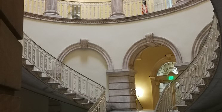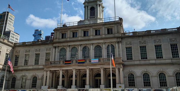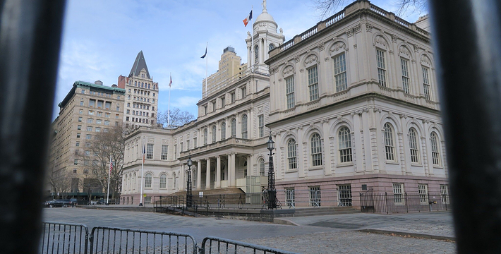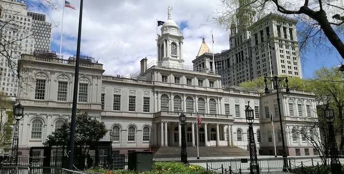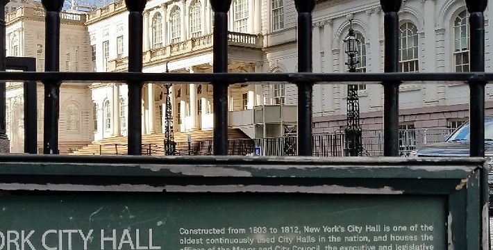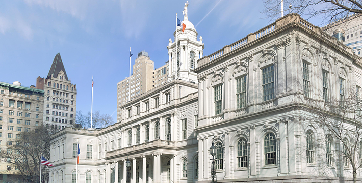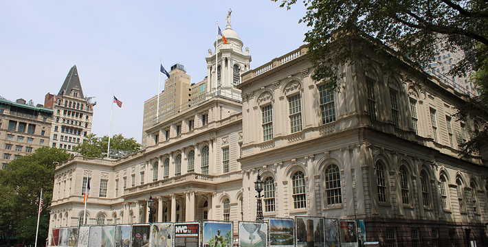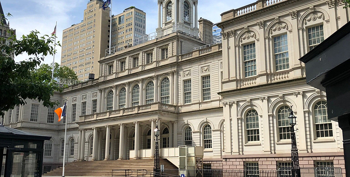 纽约市政厅坐落于曼哈顿下城市政中心区的市政厅公园中央,被百老汇大道、Park Row和Chambers街围绕。市政厅本身仍然作为政府办公的场所。纽约市政厅建于1803至1812年,1966年被收录至美国国家史迹名录,成为美国国家历史建筑。它的圆形大厅也是纽约市的地标。