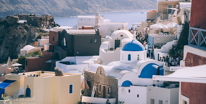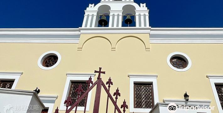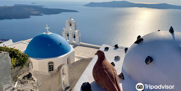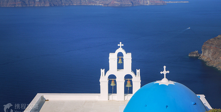在圣托里尼岛,蓝顶教堂是圣岛的地标性景点,多次出现在众多旅游杂志的封面上。圣岛的蓝顶教堂不止一个Fira和Imerovigli之间的崖壁上,面西向海。