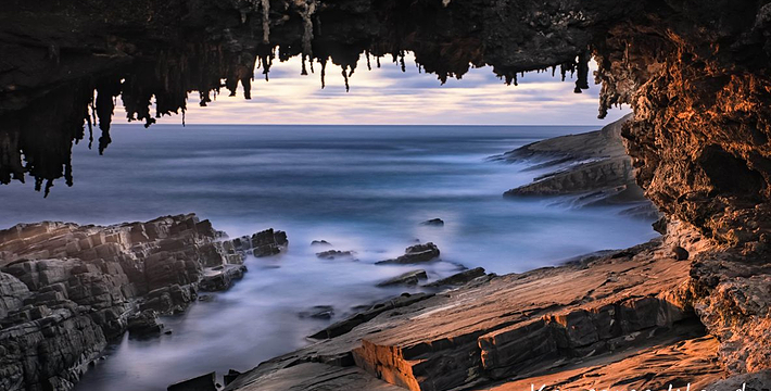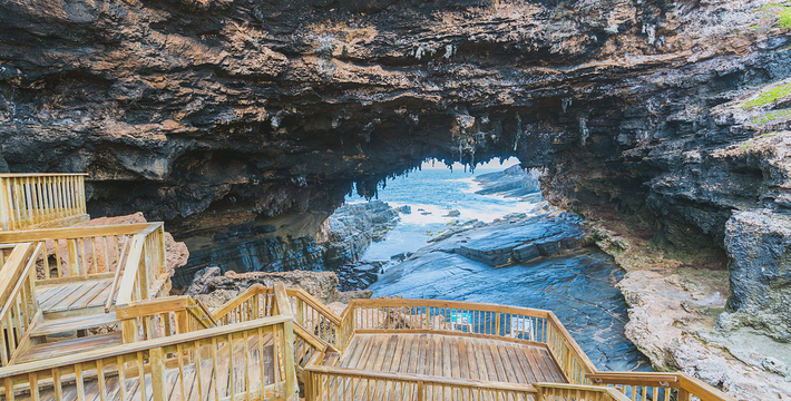 天涯海角悬崖坐落于袋鼠岛的西南角,面对浩瀚无际的南大洋,是岛上观海的绝妙之地。在天涯海角悬崖之下,沿海伫立的旗舰拱门同样令人叹为观止。它是经过海风海水长年累月侵蚀而形成的天然拱廊,日日夜夜经受着排山倒海般的巨浪冲刷。