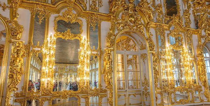 和宫外的清新气质不同,宫殿内可谓是流光溢彩,被金光所笼罩,极尽奢华。从入口处穿过叶卡捷琳娜宫一层长廊,来到通往二层的主楼梯,主楼梯较有特色,双向采光,装饰上有点洛可可的风格,在楼梯两边的摆放着大理石雕塑“睡觉的爱神”与“苏醒的爱神”。二层右侧入口处还有2个展厅,经常会举办各种文化展出。
