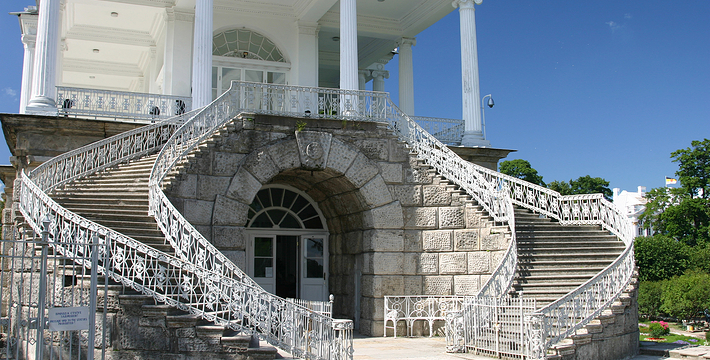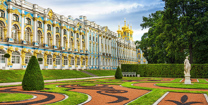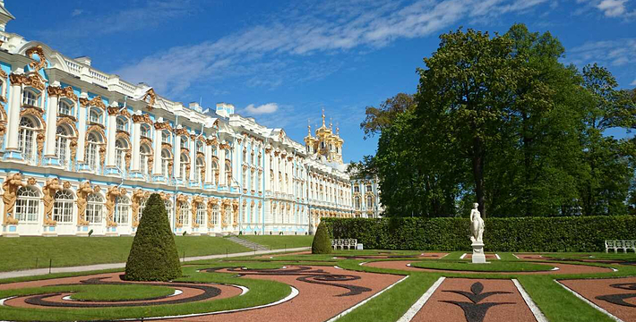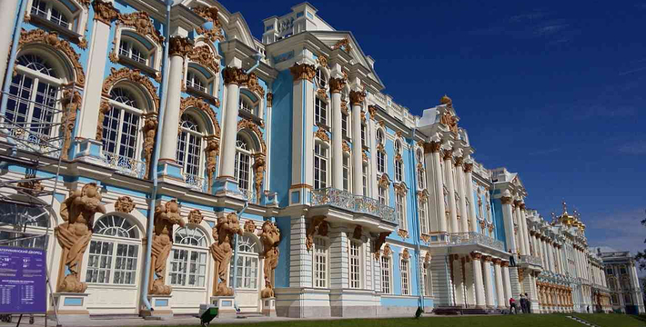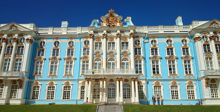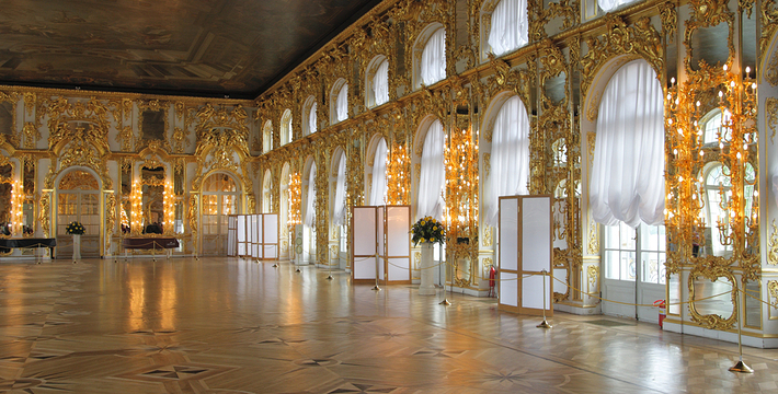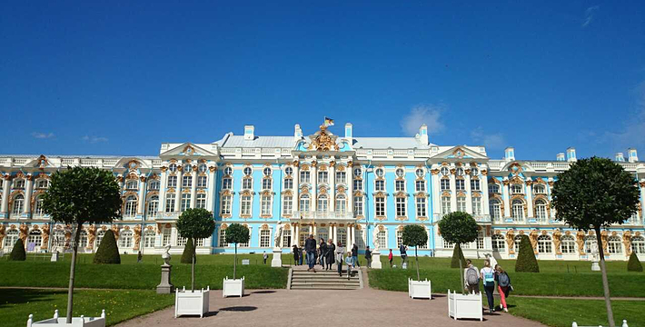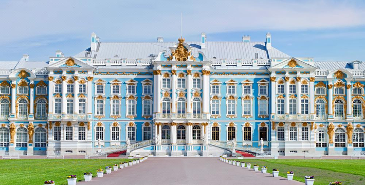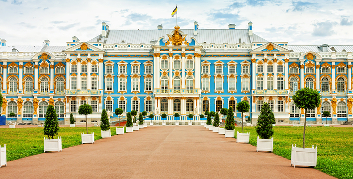 叶卡捷琳娜宫又称凯瑟琳宫,位于圣彼得堡以南约25公里处,是1717年特别为彼得一世的第二任妻子、皇后叶卡捷琳娜而建的夏日别墅。也是其女儿伊丽莎白女皇、叶卡捷琳娜二世、亚历山大一世及尼古拉二世最喜爱的郊外行宫。为了彰显皇家领地的身份,宫殿所处的一带(包括亚历山大宫、亚历山大花园以及白塔观景台等)在其建成后即被称为沙皇村或皇村。1937年为纪念普希金在此度过童年又改为现名“普希金村”。