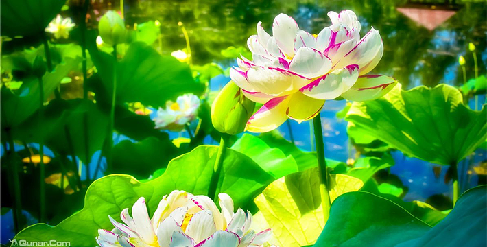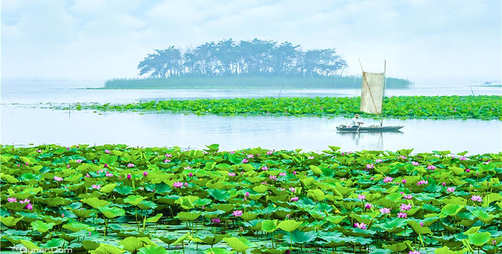 景区山水辉映、碧水白帆、红荷绿苇、鸥鹭翔集,一年四季,如诗如画。
