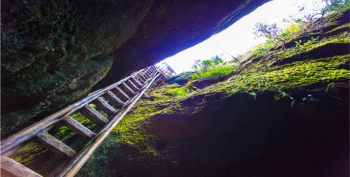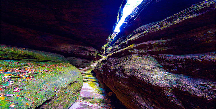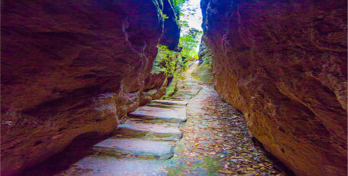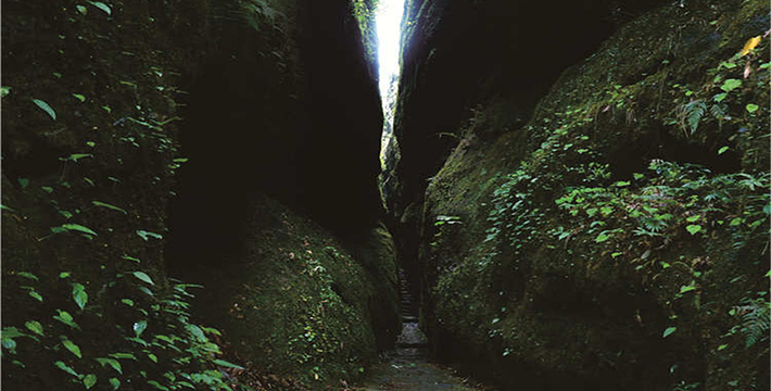 天成奇峡的独特景观,是同一座山上相隔不足百米有两道一线天,故名雌雄一线天,从下往上望,但见一线天光,狭窄之处须侧身而过。游人可以从雌一线天往山顶登,从雄一线天下来。