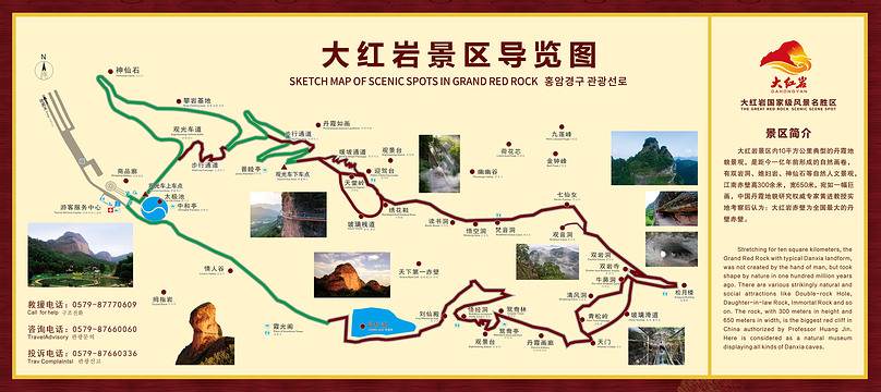 浙江省重点风景名胜区武义大红岩景区座落在武义县中部,44省道上松线西侧,距县城18公里。是武义旅游的核心景区,有近10平方公里的典型丹霞地貌。"十里丹霞,十里画廊",是大自然的鬼斧神工造就的一幅精美绝伦的自然画卷。景区内生态植被保存完好,竹海、松林郁绿,赤壁、峡谷、洞穴星罗密布;有丹霞地貌共有的沟、谷、洞、柱、壁;象形的狮、象、鲸、猴、龟千姿百态,惟妙惟肖。还有始建于南宋时期的山顶洞穴寺院――双岩禅寺,更有观光、考古价值,寺院内藏存有禅师的归骨塔基、明代石佛、大学士宋濂篆写碑额的石碑等珍贵历史文物。游红岩,人在画中,美景尽收眼底,感万物精灵之无穷;访崆峒,身在仙境,受一番仙气洗涤,抛俗世尘嚣于万里。感天地之灵气,风景这边独好!