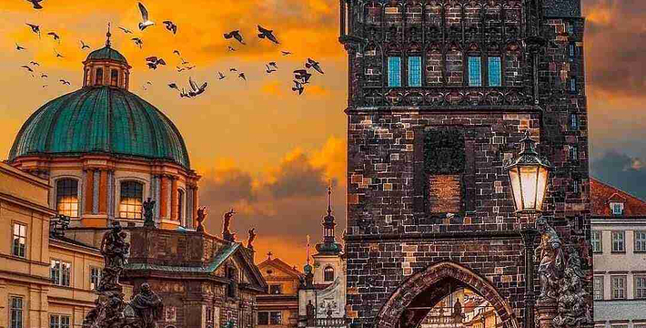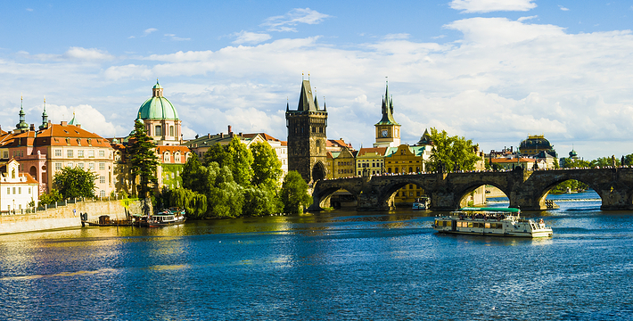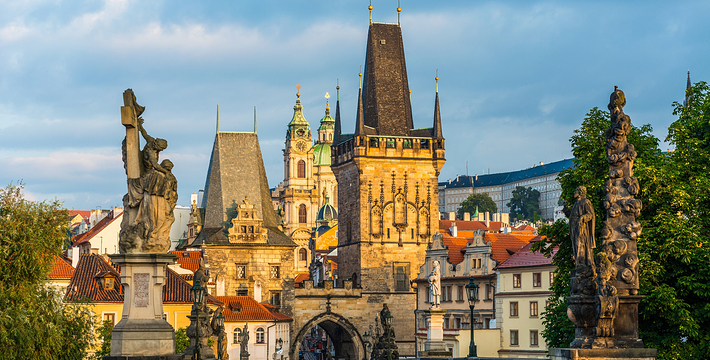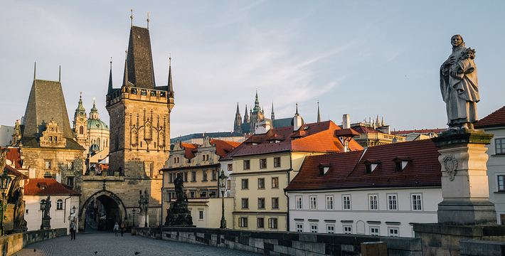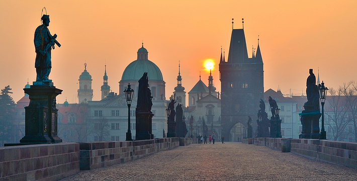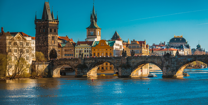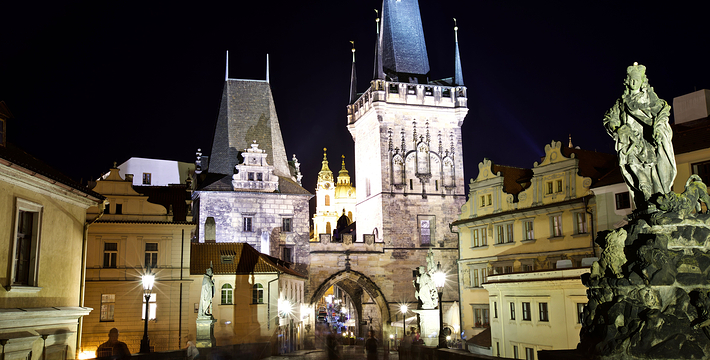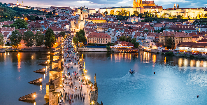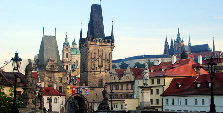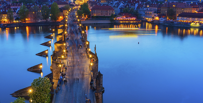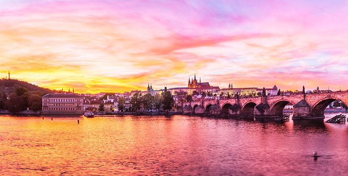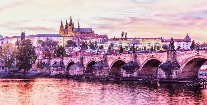 查理大桥建于1357年,是一座14,查理大桥就横跨在伏尔塔瓦河上,桥长520米,宽10米,有16座桥墩,大桥两端是布拉格城堡和旧城区,查理大桥是历代国王加冤游行的必经之路。在桥上可以观赏到艺术家的表演,还有一些手工艺创作表演,已经成为布拉格艺术的展示场所,在桥上还可以买到很多艺术品,表现查理大桥的水彩画,以及身着传统捷克服装和宫廷服装的木偶。查理大桥30尊圣者雕像,都是出自捷克17~18世纪巴洛克艺术大师的杰作,被欧洲人称为“欧洲的露天巴洛克塑像美术馆”。现在原件已经保存在博物馆内,大部分已经换成复制品,据说只要用心触摸石雕像,便会带给你一生的幸福,桥上的一尊铜像的某些部位已被游人摸得发亮。其中桥右侧的第8尊圣约翰雕像,是查理桥的守护者,围栏中间刻着一个金色十字架位置,就是当年圣约翰从桥上被扔下的地点。