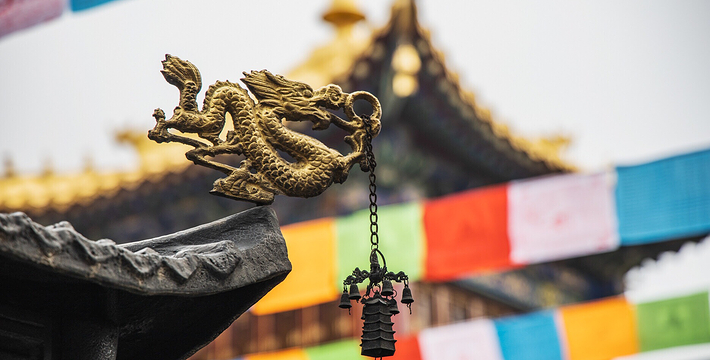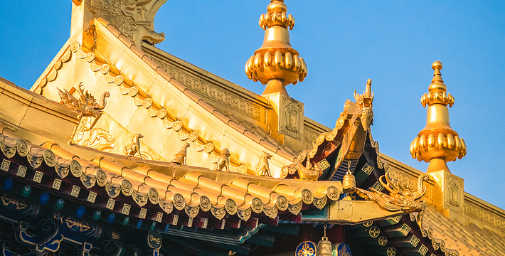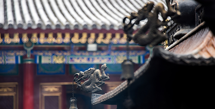 大雄宝殿、藏经殿、法堂三重殿堂,两侧有配殿、厢房、跨院,殿堂画栋雕梁,十分富丽。
