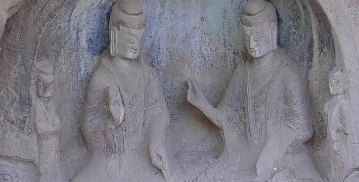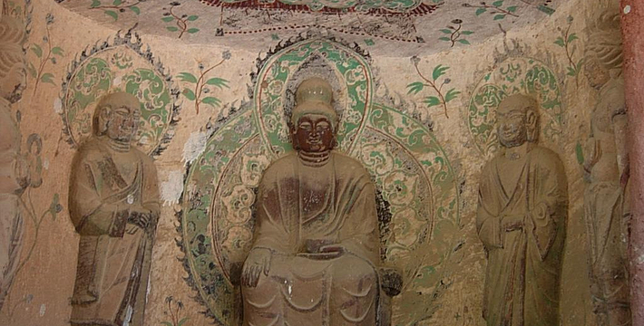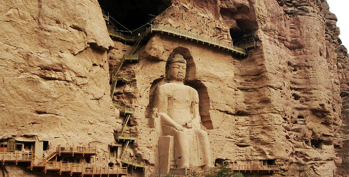 炳灵寺石窟位于甘肃永靖县城西约50公里的积石山中。“炳灵”为藏语“千佛”或“十万佛”之意。石窟开凿在黄河北岸大寺沟的峭壁之上。峭壁长2公里,上下四层,高低错落。其上的洞窟为西秦、北魏、北周、隋、唐直到明、清各代的作品,唐代的约占三分之二。据统计,上有窟龛183个(其中窟34个,龛149个),大小佛像694尊,泥塑82尊。另有石雕方塔1座,泥塔4座,壁画约900平方米。编号为169的洞窟“唐述窟”,此窟造于十六国的西秦(385年~431年)时期,距地面约60米,内有西秦造像,造型刚健挺拔,线条流畅,扬绘壁画,构图古雅,画中人物衣袂飘逸,栩栩如生。窟北部有墨书题迹一方,上书“建弘元年”(420年)字样。1967年兴建刘家峡水电站时, 为保护石窟,特在窟前修筑防水大堤,长约200米,高约20米,坝前粼粼碧波,坝后岩窟崔巍,景色蔚为壮观。游人乘游船即可直达窟前。