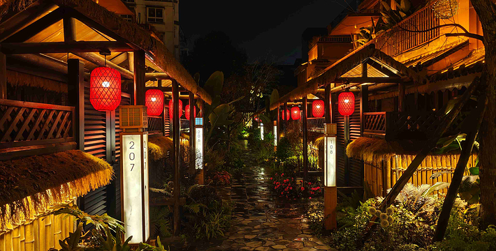 酒店以禅文化为主题,设计古朴典雅,空灵清秀。酒店的每一处设计都独具匠心,设计师对每一处细节精雕细琢,处处隐喻东方美学的质朴。有人说,不住客栈等于没去拈花湾。拈花湾12家主题各异的禅意客栈,蕴含深厚的禅宗底蕴,连接并承载着拈花湾禅意生活的精华。栖居在这些禅意客栈中,茅草屋、树皮瓦、篱笆墙……传递源自汉唐的拙朴美学,感受东方禅境的魅力。茅草屋顶、原木家具、素色面料,一切都是那么的不经意,天然去雕饰。设计师更认为木材是有生命的。置身在这样一个清丽如水、沉淀如钟的“世外之家”,一颗心也被浸润的晶莹剔透,不惹半点尘埃。香月花街,一条横贯南北、网络东西、联接五湾的热闹小街。景色宜人的街道布满了各色的店铺,但丝毫不觉嘈杂,因为这里的每一家店,都与“禅”结了缘。在茶道馆,点上一壶清茶。平日里慨叹生活走得太快,来不及回望来时的路,那就在这里,让时间慢下来。在抄经馆,用虔诚、恭敬的心,抄下一段段经文,当整个身心投入其中之时,便可收摄乱心,将心沉淀。