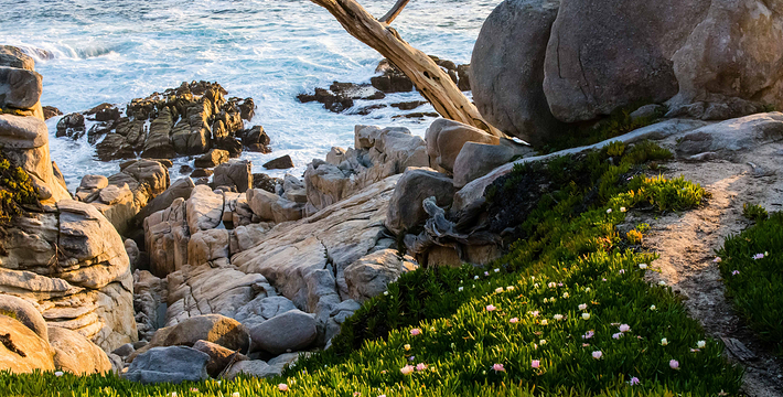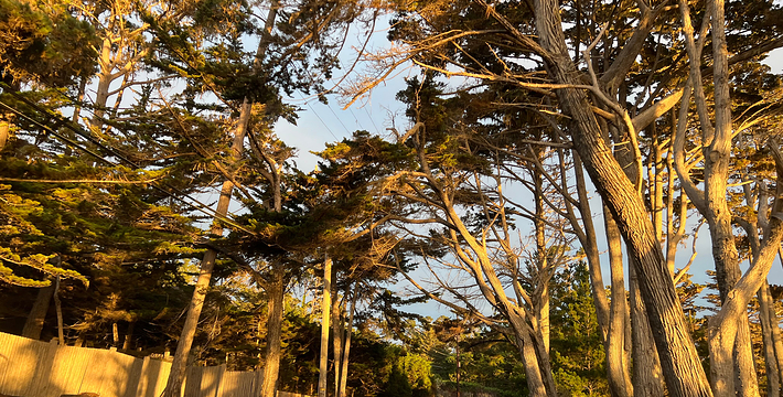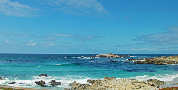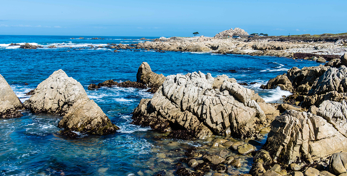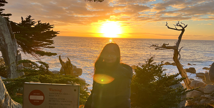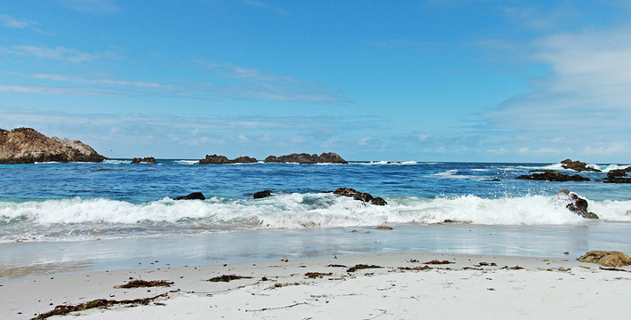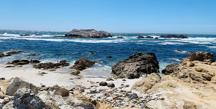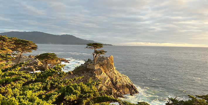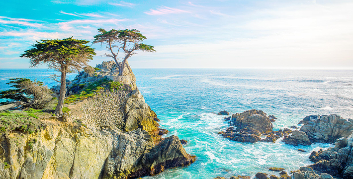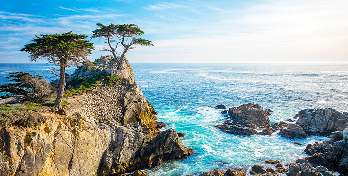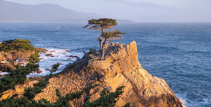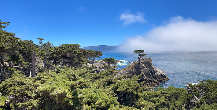 在美国西海岸,加州中部的蒙特利县内,有一段圆环状道路,它围绕着著名的高级私人住宅区,道路的西侧和南侧紧邻太平洋,东侧穿越代尔蒙特杉树林,这就是著名的17里湾风景线,也称为17英里路,它是加州一号公路的精华所在。沿途不仅能看到碧海蓝天,白色沙滩,行驶在崎岖蜿蜒的山路上,奇松怪石一步一景,美不胜收。还不时可见壮观的豪华别墅和4个高尔夫球场。由于它是高级私人住宅区的主干道,属于私人公路,因此非住宅区居民进入游览需要付费,按车收费,一辆车9.75美元,公路的入口建有收费站。17英里路共有四个关口,主要关口毗邻加州一号公路,车辆需从蒙特雷往卡梅尔方向行驶,入口在Pacific Grove,出口为Carmel。一路有不少景点,可以下车走走、拍拍照,或驻足欣赏美丽的景色。沿途会先路过西班牙湾(Spanish Bay),这是一处漂亮的海滩,由于海滩上有很多礁石,游人可以漫步在海滩上的木栈道上,远眺大海。过了西班牙湾一路向前行驶,便可来到美丽的Sunset Point,这里的礁石上和海滩上可以看到很多慵懒的海豹,非常可爱。过了Sunset Point之后便可来到17英里的标志性景点被称为“孤独柏树”(The Lonely Cypress)的树,这棵树挺拔的屹立在海中的礁石上,日夜眺望着大海彼岸。在附近也有很多已经枯死的柏树,造型非常诡异,也被称为“鬼树“,这些柏树即使枯死,但却依然优雅。17英里路上不仅风景好,空气也好,各种弯道,蜿蜒曲折——卵石滩高尔夫球场,绿意盎然的球场非常漂亮。一路上除了美丽的海岸线美景外,还有各种好看的房子,主人把自家的庭院修剪的整整齐齐。沿着卡梅尔海滩继续前行,便抵达出口,进入卡梅尔小镇,这是蒙特雷半岛上一个精品小镇,也是度假胜地。欣赏过17里湾的美景后,可以在小镇上享用美食,留宿一宿,更可以继续上路,正式开始一号公路之旅。