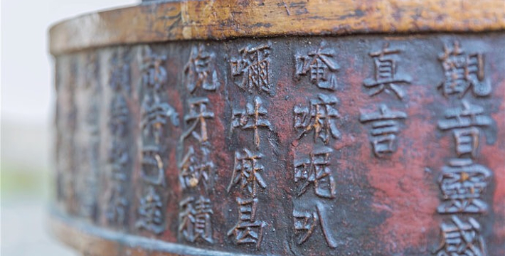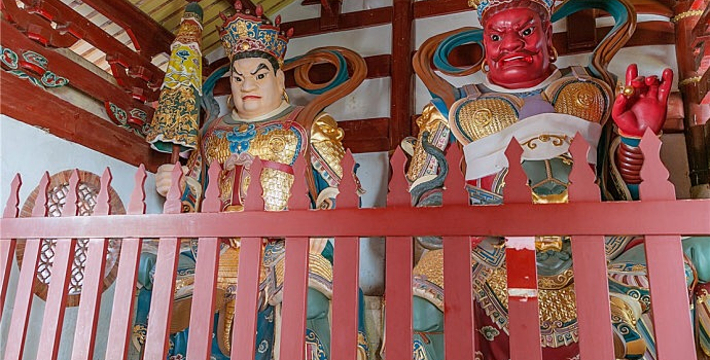 寺门坐东向西,入门处为月台,高悬“月台”二字竖匾。进入山门,不见拜亭,而是条幽幽的长道,长道的南侧,是七座佛塔。中轴线上的建筑依次是天王殿、弥勒殿、大雄宝殿、法堂、文殊殿。大雄宝殿前有两口“放生池”,池旁有两座“飞来塔”。