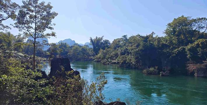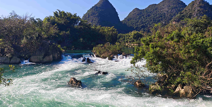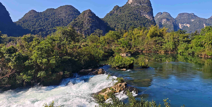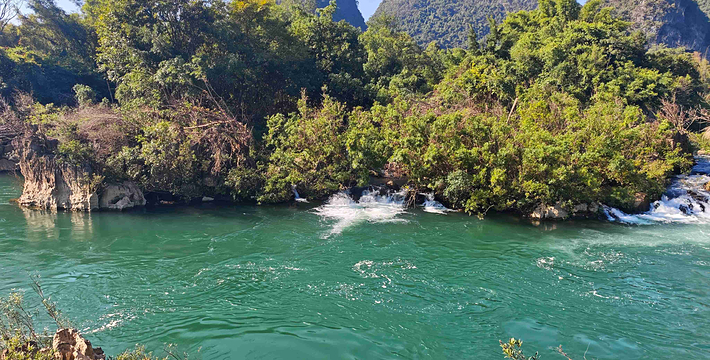 广西大新县有一条名为黑水河的河流,曲折而行,在青山绿水间蜿蜒出一个个风景秀丽的神奇景观。其流经雷平镇安平村时以得天独厚的地理环境,集山水之精华,纳黑水河之传奇,成一方美丽河山,故称其为安平仙河,其两岸青山秀水,青竹苍翠欲滴,沿江泛舟,处处青山,构成“山水与长天共一色”的自然景观。