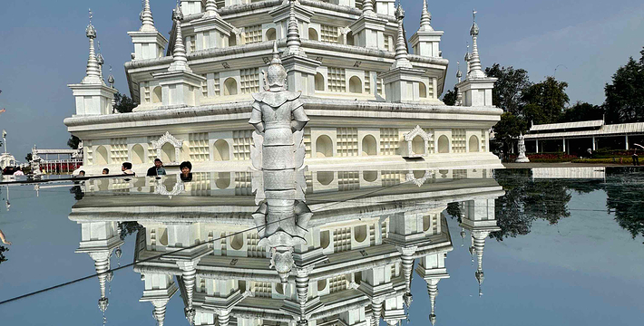勐焕银塔占地面积约120亩,总投资1.7亿元。塔高66米、直径46米。景区按照“保护环境、适度开发、可持续发展”的理念,有效利用傣族文化这条主线,以保护和融合原有生态景观为核心,让游客在游览景区的同时,亦能感受自然、亲近自然。景区由吉缘林、银轮广场、瞭望台、人行栈道、景观雕塑等各类主体建筑构成,配有相应的灯光布景区、花卉观赏区,花卉观赏区种有地涌金莲、三角梅、文殊兰、贝页粽等花草植物。整体建筑以纯白为基调,与勐焕大金塔在色彩上形成鲜明对比,两塔屹立在雷崖让山之巅、孔雀湖之畔,一个雍容华丽,一个典雅素静。
