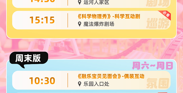 4、为确保游客安全,园区部分设施可能因故障、检修或其他原因而调整开放时间或关闭,园区无需提前告知。园内部分设备有身高(190cm以上)、体重(90kg 以上)、年龄、身体状况等限制,详情请在入园前详细阅入园须知或咨询现场工作人员或致电400-139-8666咨询;