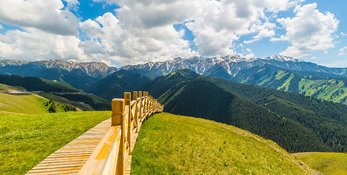 果子沟大桥全称果子沟双塔双索面钢桁梁斜拉桥,该桥地上部分建设于07年8月22日开始浇筑。果子沟大桥是国道045线赛里木湖至果子沟口高速公路建设项目控制性工程之一,桥梁全长700米,桥面距谷底净高达200米,主塔高度分别为209米和215.5米,大桥主桥全部采用钢桁梁结构,使用国内特殊专用桥梁钢材17000吨,并采用高强螺栓连接,安装精度控制在两毫米以内。大桥是自治区公路第一座斜拉桥,也是国内第一座公路双塔双索面钢桁梁斜拉桥。蓝天白云下的果子沟大桥,群山相伴、森林为衬、气势磅礴、雄伟壮观,一派豪迈的景象!