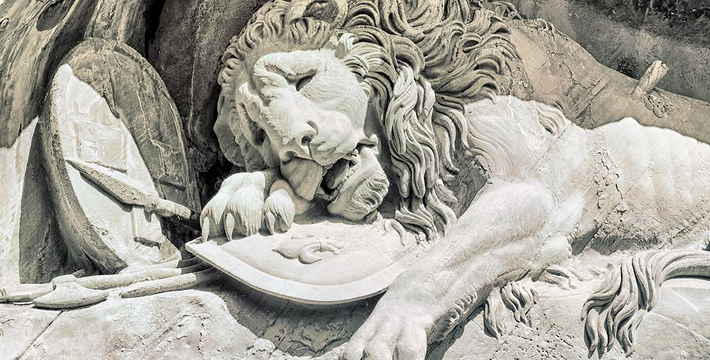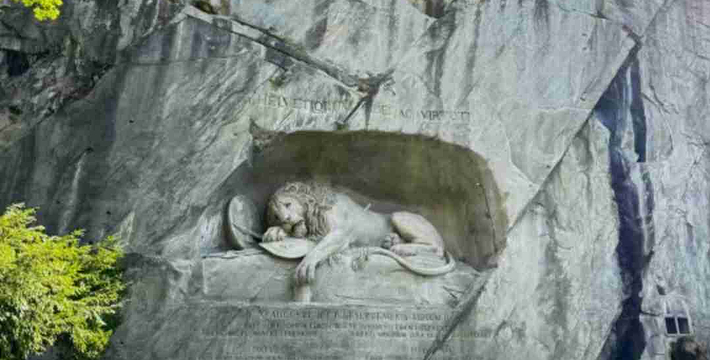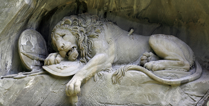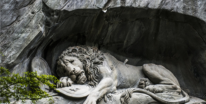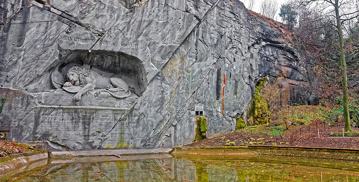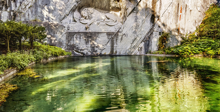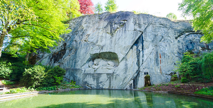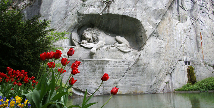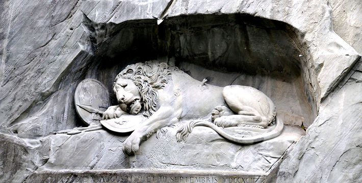 狮子纪念碑(Lion Monument)是卢塞恩数一数二的雕刻作品,一只箭深深地插进了濒临死亡的雄狮背上,狮子面露痛苦的神情,前爪按盾牌和长矛,盾牌上有瑞士国徽。这是为了纪念1792年法国大革命,暴民政击法国杜乐丽宫(Tuileries)时,为保护法王路易十六及玛丽王后而死的786名瑞土军官和警卫所建的纪念碑,意在祈求世界和平,碑的下方有文字描述了此事件的经过”。