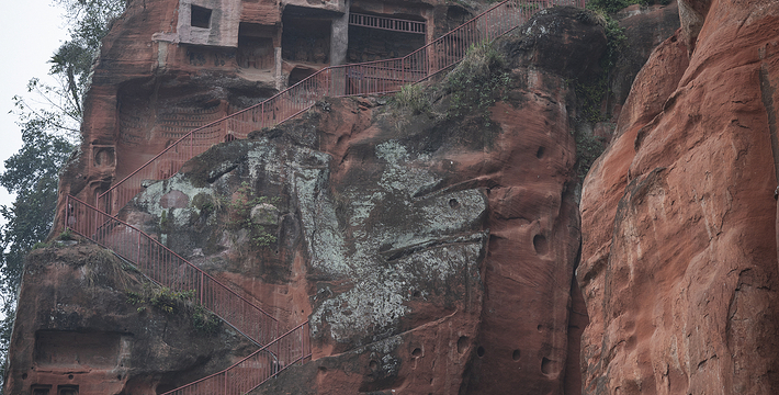 大佛左侧,沿“洞天”下去就是近代开凿的凌云栈道的始端,全长近500米。右侧是唐代开凿大佛时留下的施工和礼佛通道——九曲栈道。爬上栈道,能从不同高度瞻仰大佛威仪。