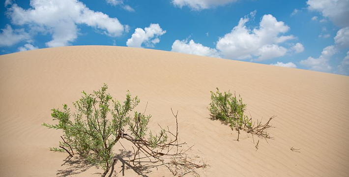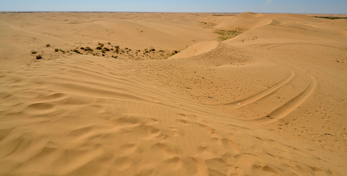 毛乌素沙漠面积达4.22万平方公里,万里长城从东到西穿过沙漠南缘。据考证,古时候这片地区水草肥美,风光宜人,是很好的牧场。后来由于气候变迁和战乱,地面植被丧失殆尽,就地起沙,形成后来的沙漠(沙地)。这里曾流传着“榆林三迁”的故事。今非昔比,现在的榆林已是“塞上名城”。