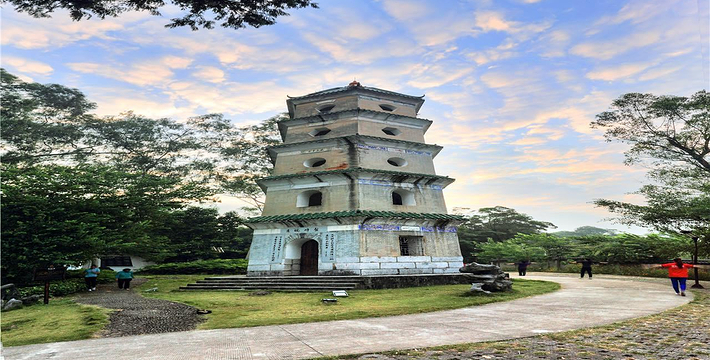 宝塔脚下的小山坡,有一清幽古寺-永安寺,寺内经声回荡,香火不断。每当夕阳西下,霞光照耀,百鸟归巢,鳌山宝塔就显得分外妖娆。2005年,梁羽生回了一趟国,蒙山县人民政府投入700多万元将鳌山宝塔所在的小山辟为梁羽生公园。