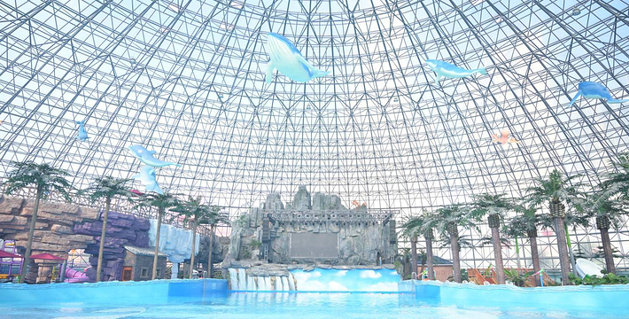 温泉水世界建筑面积8000平米,由直径100米的圆形钢构及钢化玻璃组成,空高24米,绿化面积1000平方米。温泉水世界由海浪池、漂流河、雪橇滑道、炮筒滑道、螺旋滑道、儿童水寨、迷你飞天梭、9D影院、VR体验馆、游泳池、世界名泉等11个项目组成,可同时容纳2000人同时戏水游乐。室内智能温控系统,全年保持28-30度恒温,为游客提供人体感觉舒适的温度,即使在寒风刺骨的冬季,游客仍可在温暖的室内游水嬉戏。