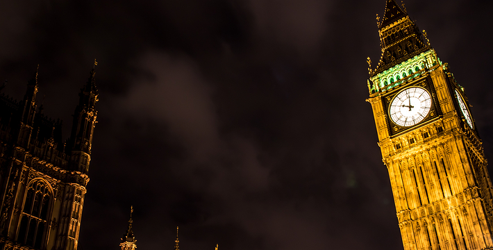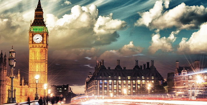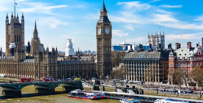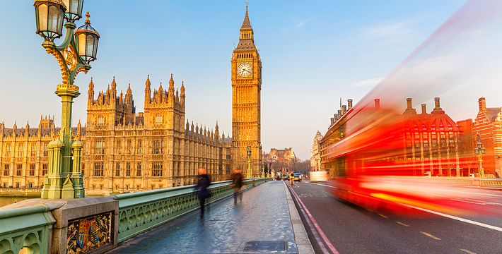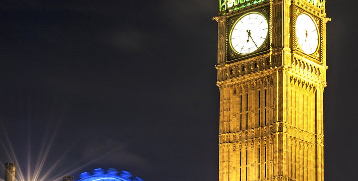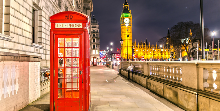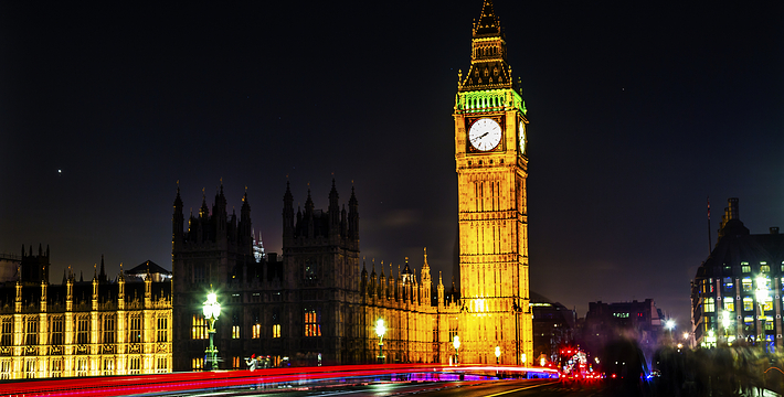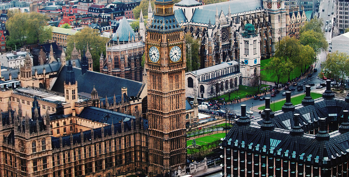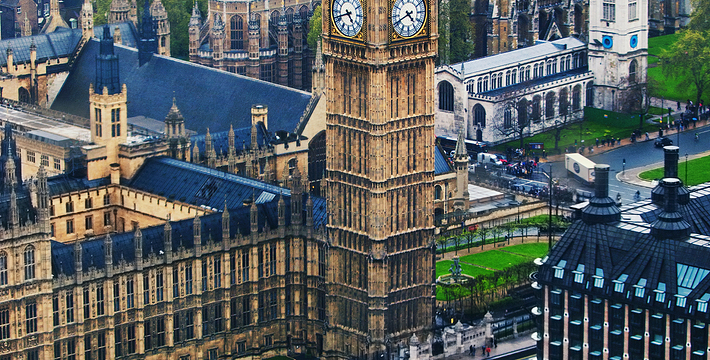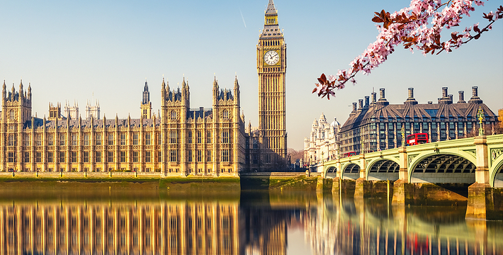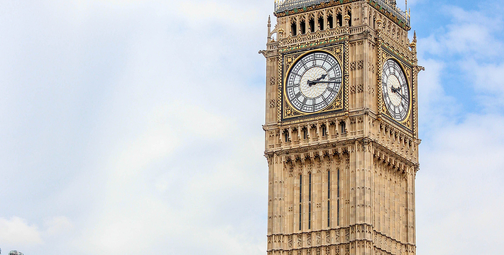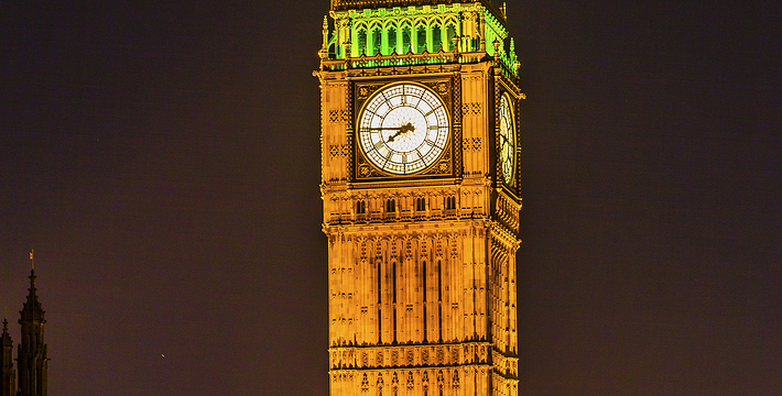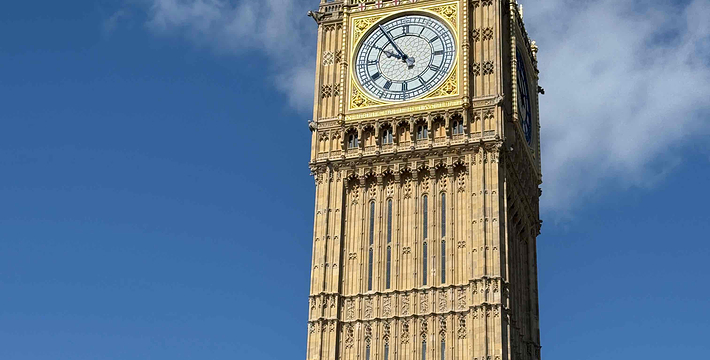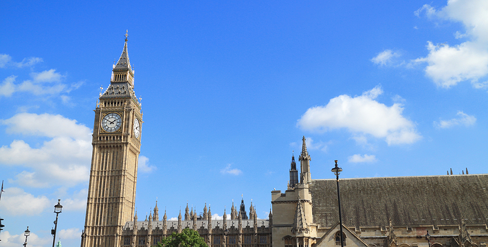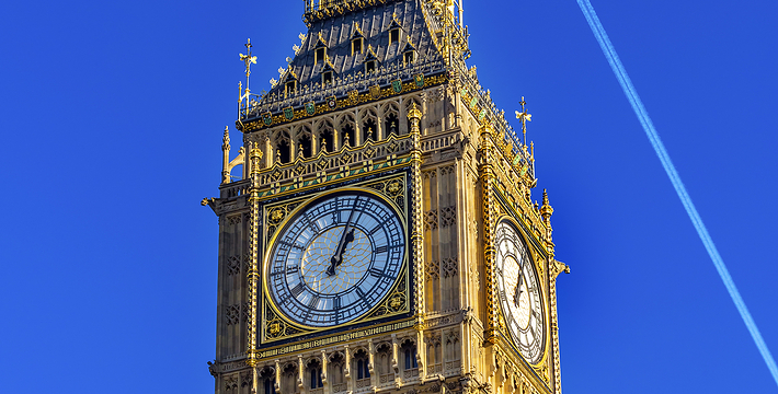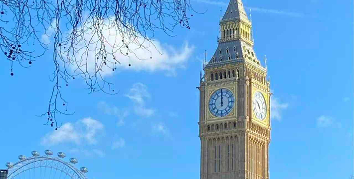 “大本钟 ”坐落于泰晤士河畔议会大厦的北面,耸立着高高的钟楼,镶有大钟,名为“大本”。每隔一小时,大钟根据格林威治时间发出沉重而铿锵的响声,在数英里之外也能听到钟声的回荡。