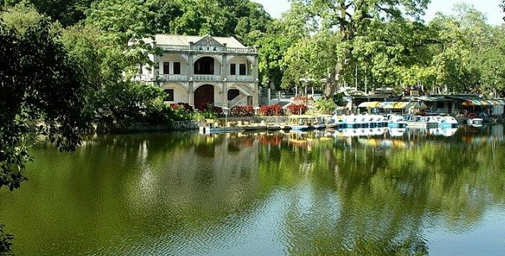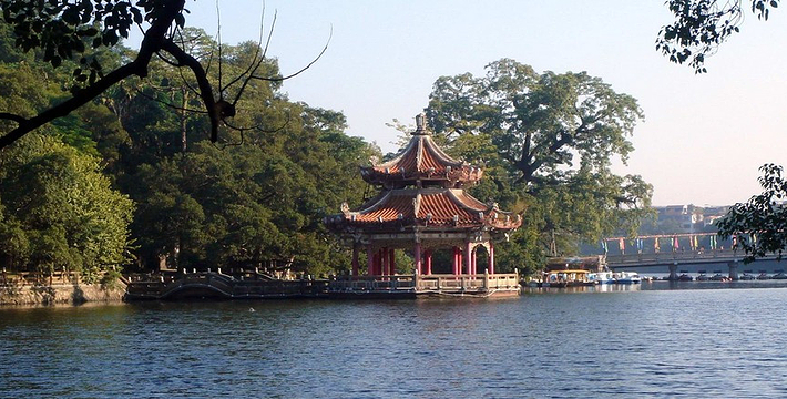 潮州西湖,山倚湖苍翠,湖傍山青黛。昔时是潮州古城的护城濠,俗称“城壕池”。今天随着城市建设重心的西移,这里已成为古城区与新城区绿色的分水岭,也是名城腾辉一脉相承的纽带。在贯彻实施“保护古城区,建设新城区” 的城建方针中,两者当互相兼顾、齐驱并进。假若潮州的城建规划已定位在山水园林式之中,那么,西湖便是古城区一片碧绿的园林肺叶,堪称新世纪环保城市的绿色明珠 西湖古昔是韩江的支流,也是崩堤冲成的瘦大湖。据《方舆纪要》载:“绵亘十余里。”到了唐代筑了北堤,才把它与韩江切断,成了宽阔长形的大湖。唐肃宗乾元年间(758—759年),皇帝下诏,天下临池带郭处设置放生池八十一处,这西湖便是其中一处(过去西湖山麓尚刻“放生”二字,现在湖心亭南侧有一池,称为放生池)。
