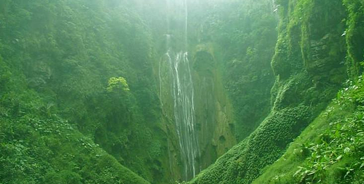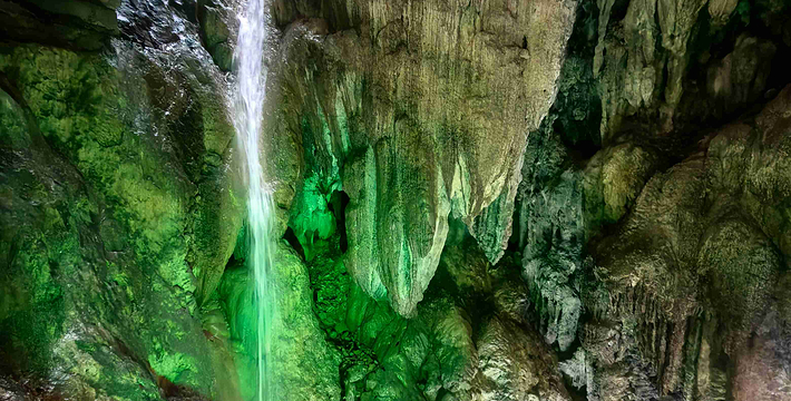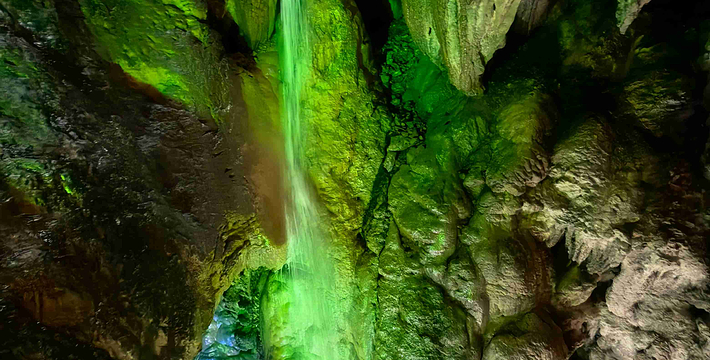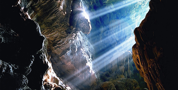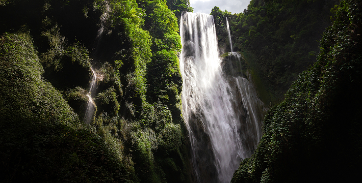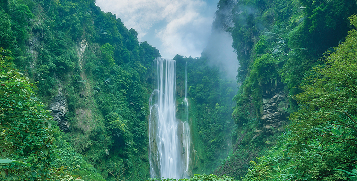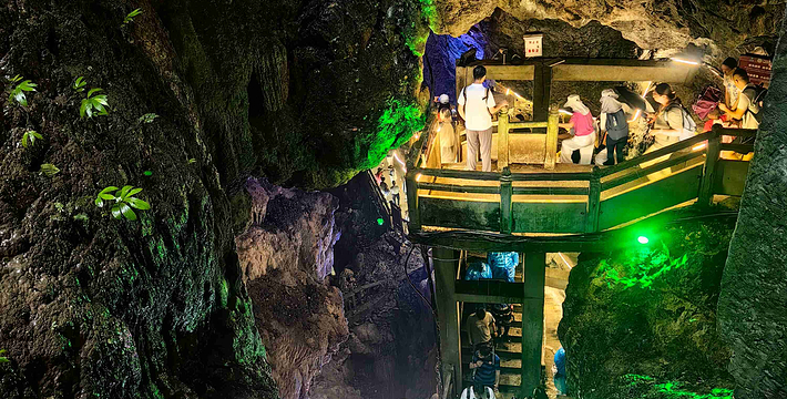 走进通灵大峡谷,巨型钟乳石高崖倒悬,古树老藤遮天蔽日,还有神秘莫测的洞穴和星罗棋布的深潭,可谓千奇百怪。通灵大峡谷由念八峡、铜灵霞、古劳峡、新灵峡、新桥峡组成,总长10多公里。念八河从古龙山脉缓蜒而下,依次穿越五个峡谷,流入湖润台地。每个峡谷内荟萃了举世罕见的特高瀑布群、洞中瀑布、地下暗河、峡谷溪流、洞穴奇观、古石垒、古悬葬、原始植被等自然景观与人文景观。通灵峡,1998年4月由靖西商会凌树明、黄丰正、覃海龙、曾德铨开发,位于大峡谷南端,是一个长方形全封闭式的峡谷,长约1000米宽200多米,深300米,犹如地球突然裂开一条缝,狭长而深邃。峡谷内密密匝匝的长满了原 始古树,四周刀削般的悬崖绝壁,也旁逸斜出的长满了婆娑多姿的树木。