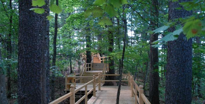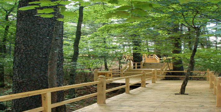 松乡桥是一座木质曲桥,横跨山谷,走在松乡桥上,可俯视山谷的多端变化,还能目睹并接触到红松。