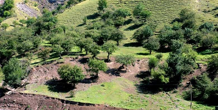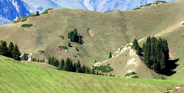 果子沟风景秀丽,景观奇异,历来被视为新疆的名胜之地”之美称。又称塔勒奇沟,因山沟内遍布野生苹果而得名。它纵贯北天山,是312国道乌鲁木齐--伊犁公路的必经通道,也是伊犁的天然门户。峡谷地势险要,自古就是中国通往中亚、欧洲的重要孔道,现在仍是乌伊公路干线的重要路段。成吉思汗西征时,始凿山通道,曾架桥48座,可见路之险峻。清乾隆时改建为42座。果子沟全长28公里,沿着乌--伊公路的大致走向,就是新疆古丝绸之路的北道。“松树头”是果子沟的绝顶之处,北下直达赛里木湖畔,南下直入果子沟峡谷。“赛里木湖”亦称三台海子,与果子沟唇齿相依,亦为新疆名胜之一。由松树头南下二台林场,山路盘旋崎岖,一落幽谷,是果子沟的险峻之处。落谷傍山有一高山瀑布凌空奔泻而下,状如白练悬空,壮观异常。二台是由清代军台、驿站得名。此处草原木屋交相辉映。从二台南下,山势渐低,谷口渐开,公路两旁只见云杉疏透,奇杨怪柳交柯,山杏、野果,满眼新绿。
